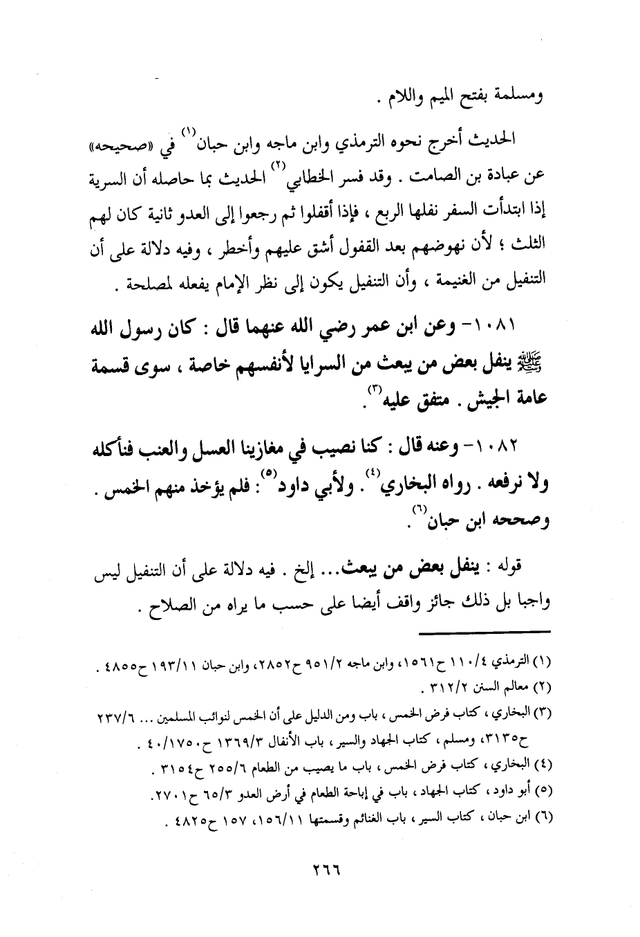 1081 - وعن ابن عمر - رضي الله عنهما - رضي الله عنهما قال: كان رسول الله - صلى الله عليه وسلم - ينفل بعض من يبعث من السرايا لأنفسهم خاصة، سوى قسمة عامة الجيش. متفَّق عليه (¬3).