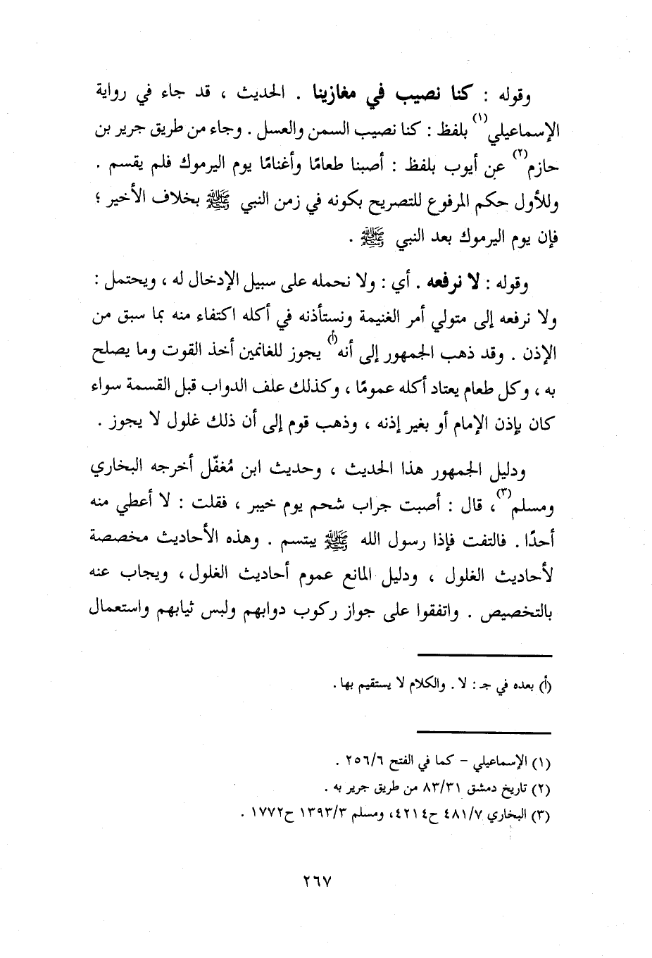 وقوله: كنا نصيب في مغازينا. الحديث، قد جاء في رواية الإسماعيلي (¬1) بلفظ: كُنَّا نصيب السمن والعسل. وجاء من طريق جرير بن حازم (¬2) في أيوب بلفظ: أصبنا طعامًا وأغنامًا يوم اليرموك فلم يقسم. وللأول حكم المرفوع للتصريح بكونه في زمن النَّبيِّ - صلى الله عليه وسلم - بخلاف الأخير؛ فإن يوم اليرموك بعد النَّبيِّ - صلى الله عليه وسلم -.