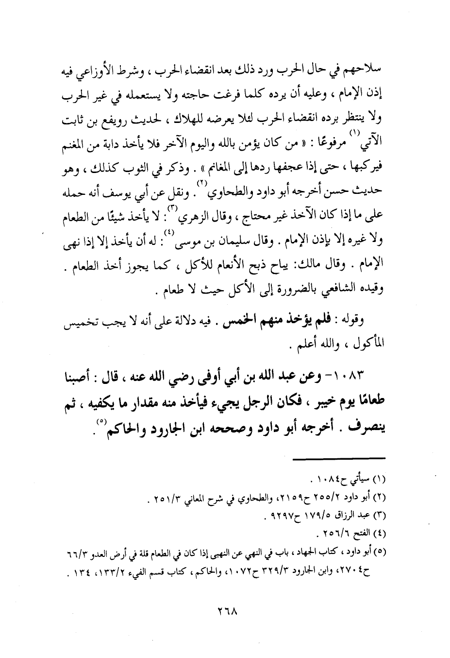 1083 - وعن عبد الله بن أبي أوفى رضي الله عنه، قال: أصبنا طعامًا يوم خيبر، فكان الرجل يجيء فيأخذ منه مقدار ما يكفيه، ثم ينصرف. أخرجه أبو داود وصححه ابن الجارود والحاكم (¬5).