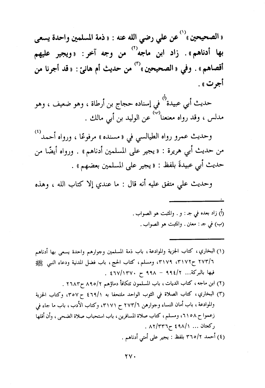(¬1) البُخاريّ، كتاب الجزية والموادعة، باب ذمة المسلمين وجوارهم واحدة يسعى بها أدناهم 6/ 273 ح 3172، 3179، ومسلم، كتاب الحج، باب فضل المدنية ودعاء النَّبيّ - صلى الله عليه وسلم - فيها بالبركة ... 2/ 994 - 998 ح 1370/ 467.