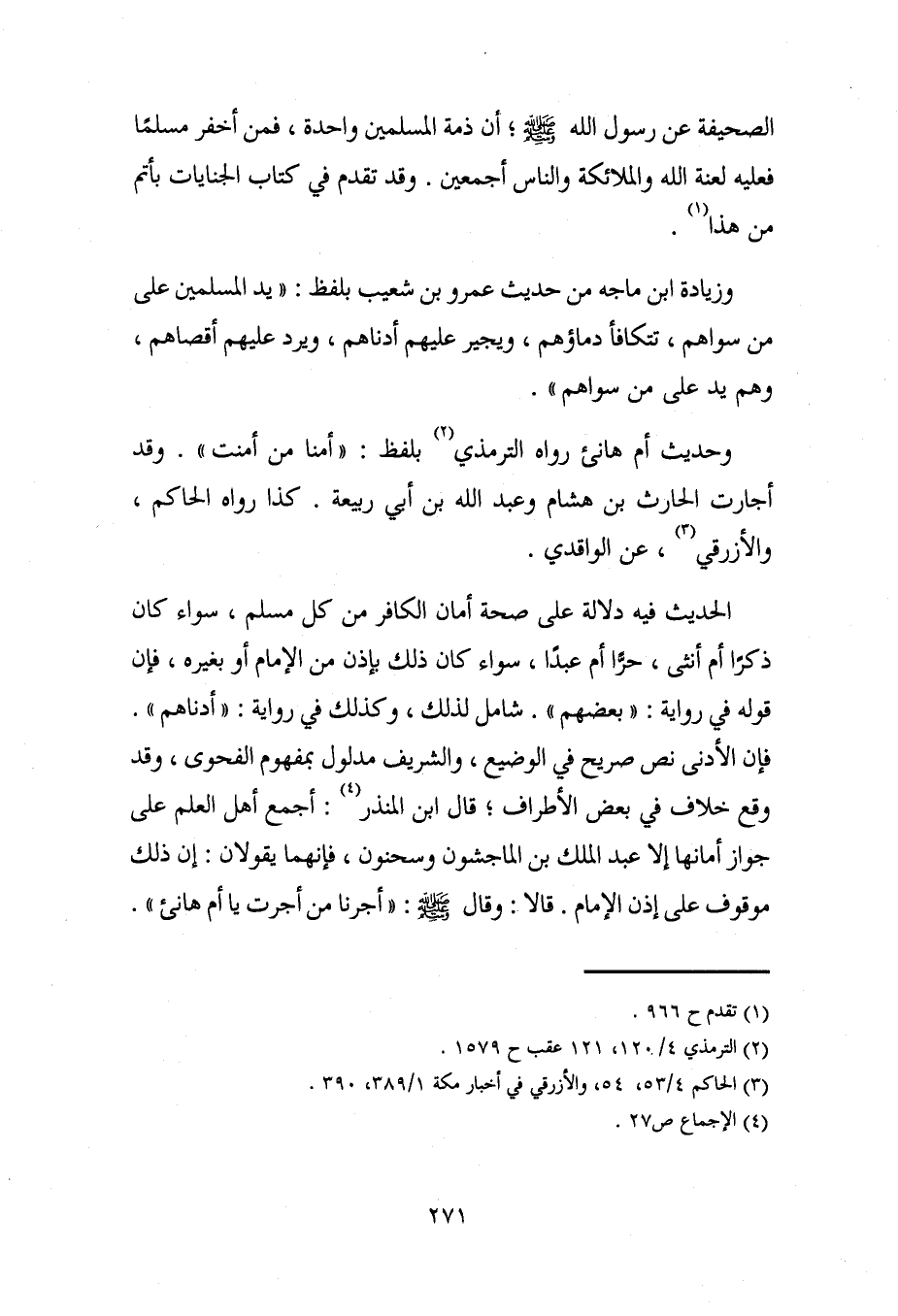 الصحيفة عن رسول الله - صَلَّى الله عليه وسلم -؛ أن ذمة المسلمين واحدة، فمن أخفر مسلمًا فعليه لعنة الله والملائكة والنّاس أجمعين. وقد تقدم في كتاب الجنايات بأتم من هذا (¬1).