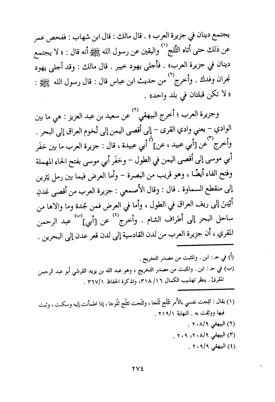 وجزيرة العرب؛ أخرج البيهقي (2) عن سعيد بن عبد العزيز: هي ما بين الوادي -يعني وادي القرى- إلى أقصى اليمن إلى تُخوم العراق إلى البحر. وأخرج (¬3) عن [أبي عبيد، عن] (أ) أبي عبيدة، قال: جزيرة العرب ما بين حَفَر أبي موسى إلى أقصى اليمن في الطول -وحَفَر أبي موسى بفتح الحاء المهملة وفتح الفاء أيضًا، وهو قريب من البصرة- وأمَّا العرض فيما بين رمل يَبرين إلى منقطع السماوة. قال: وقال الأصمعي: جزيرة العرب من أقصى عَدنِ أبْيَنَ إلى ريف العراق في الطول، وأمَّا في العرض فمن جُدة وما والاها من ساحل البحر إلى أطراف الشام. وأخرج (¬4) عن [أبي] (ب) عبد الرحمن المقري، أن جزيرة العرب من لدن القادسية إلى لدن قعر عدن إلى البحرين.
