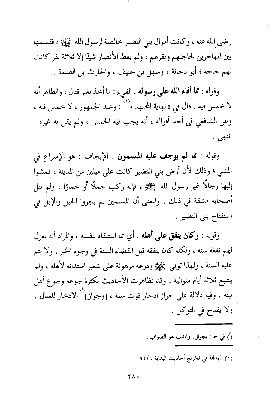وقوله: مما أفاء الله على رسول. الفيء: ما أخذ بغير قتال، والظاهر أنَّه لا خمس فيه. قال في "نهاية المجتهد" (¬1): وعند الجمهور، لا خمس فيه، وعن الشَّافعي في أحد أقواله، أنَّه يجب فيه الخمس، ولم يقل به غيره. انتهى.