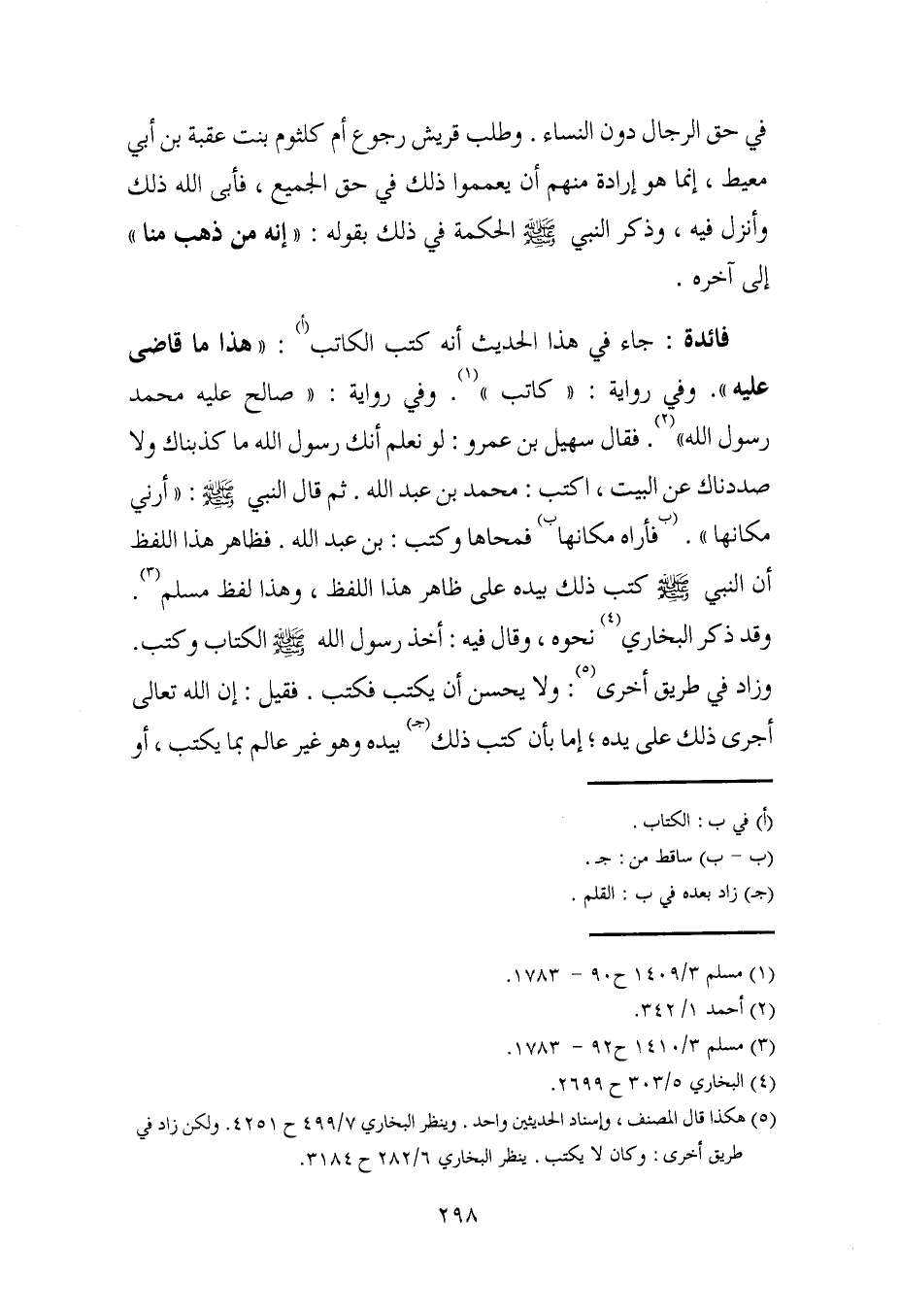 فائدة: جاء في هذا الحديث أنَّه كتب الكاتب (أ): "هذا ما قاضى عليه". وفي رواية: "كاتب" (¬1). وفي رواية: "صالح عليه محمد رسول الله" (¬2). فقال سهيل بن عمرو: لو نعلم أنك رسول الله ما كذبناك ولا صددناك عن البيت، اكتب: محمد بن عبد الله. ثم قال النَّبيُّ - صلى الله عليه وسلم -: "أرني مكانها". (ب فأراه مكانها ب) فمحاها وكتب: بن عبد الله. فظاهر هذا اللفظ أن النَّبيَّ - صَلَّى الله عليه وسلم - كتب ذلك بيده على ظاهر هذا اللفظ، وهذا لفظ مسلم (¬3). وقد ذكر البُخاريّ (¬4) نحوه، وقال فيه: أخذ رسول الله - صَلَّى الله عليه وسلم - الكتاب وكتب. وزاد في طريق أخرى (¬5): ولا يحسن أن يكتب فكتب. فقيل: إن الله تعالى أجرى ذلك على يده، إما بأن كتب ذلك (جـ) بيده وهو غير عالم بما يكتب، أو