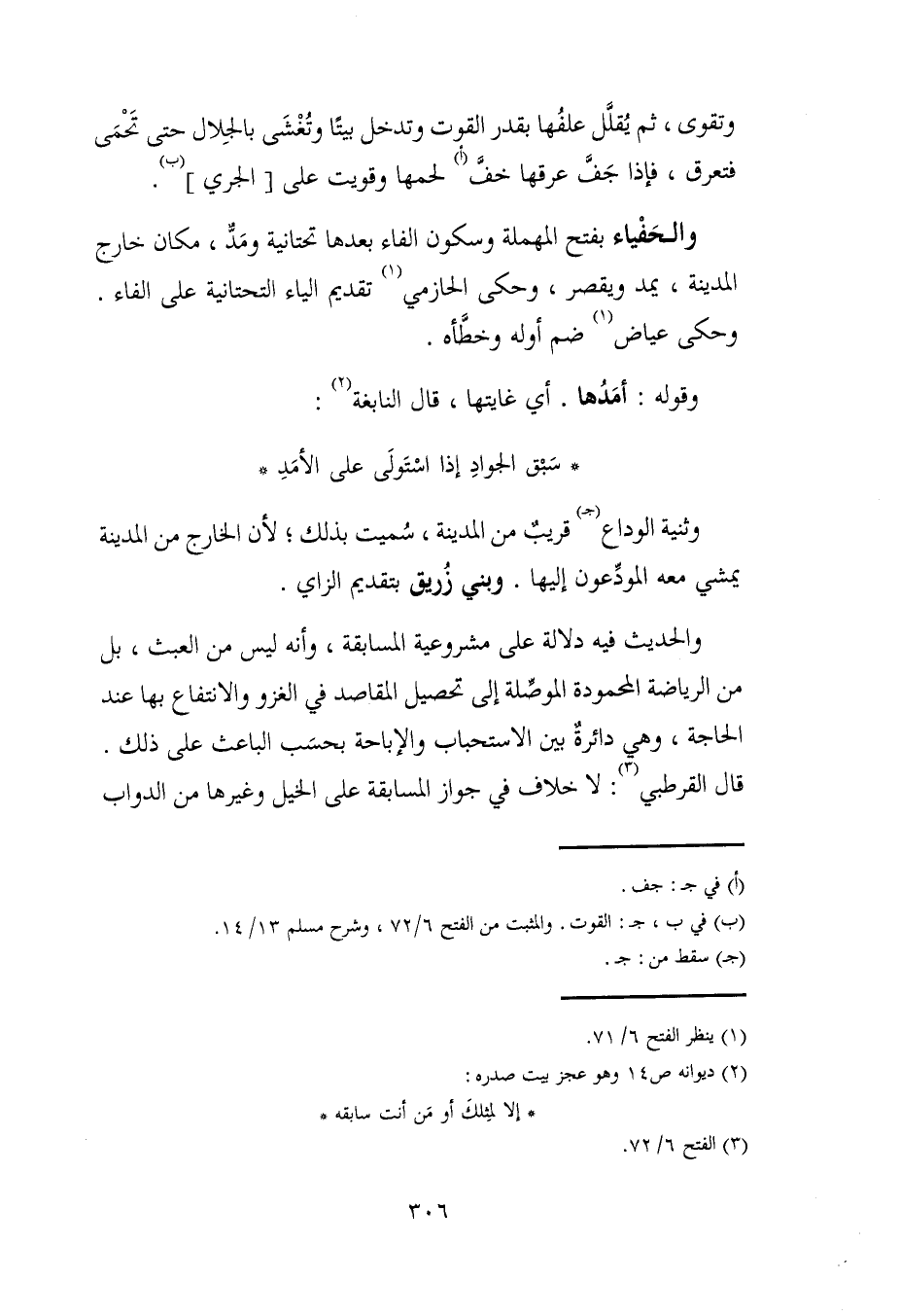 والحديث فيه دلالة على مشروعية المسابقة، وأنه ليس من العبث، بل من الرياضة المحمودة الموصِّلة إلى تحصيل المقاصد في الغزو والانتفاع بها عند الحاجة، وهي دائرةٌ بين الاستحباب والإباحة بحسَب الباعث على ذلك. قال القرطبي (¬3): لا خلاف في جواز المسابقة على الخيل وغيرها من الدواب