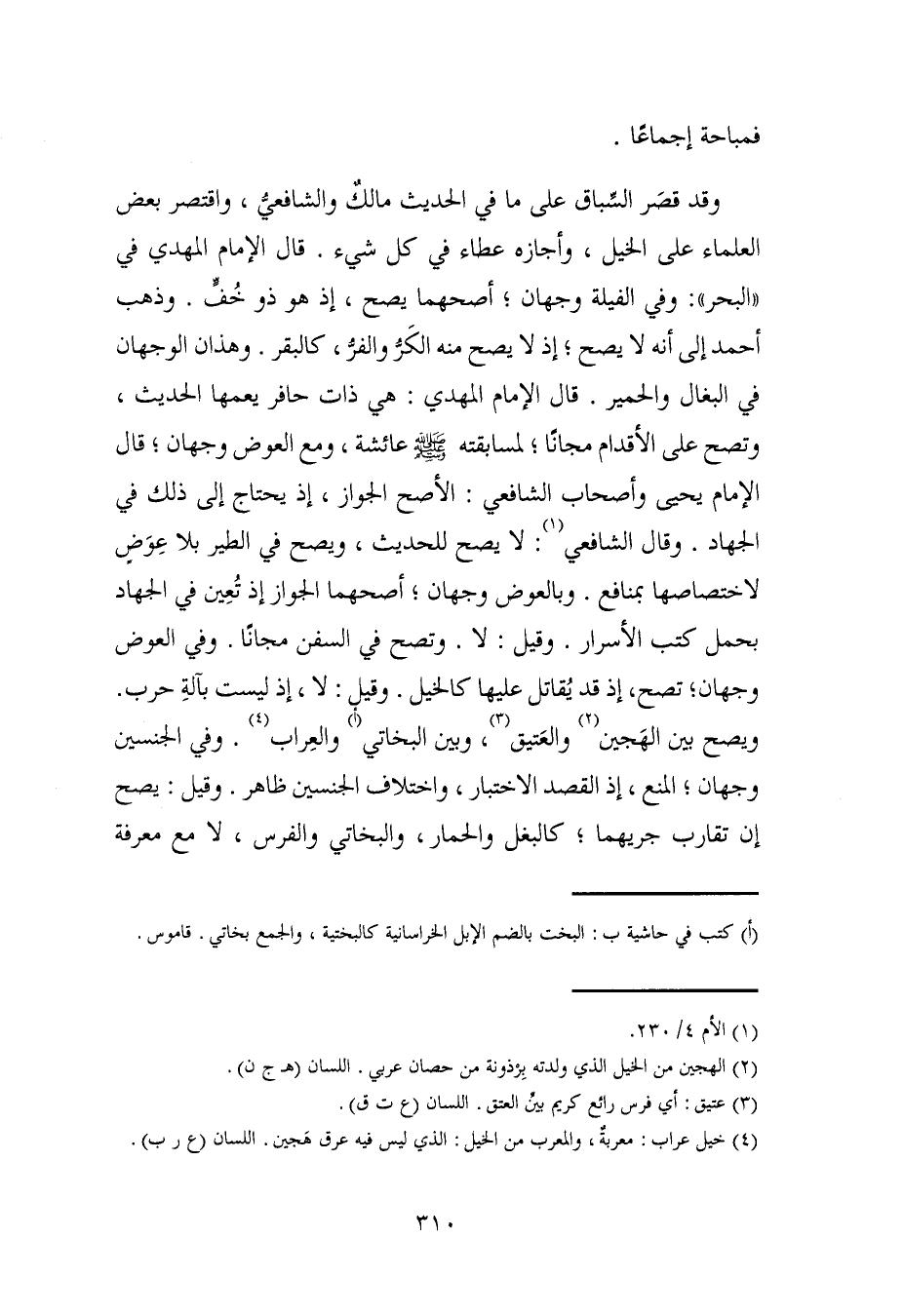 وقد قصَر السِّباق على ما في الحديث مالكٌ والشافعيُّ، واقتصر بعض العلماء على الخيل، وأجازه عطاء في كل شيء. قال الإمام الهدي في "البحر": وفي الفيلة وجهان؛ أصحهما يصح، إذ هو ذو خُفٍّ. وذهب أحمد إلى أنَّه لا يصح، إذ لا يصح منه الكَرُّ والفرُّ، كالبقر. وهذان الوجهان في البغال والحمير. قال الإمام المهدي: هي ذات حافر يعمها الحديث، وتصح على الأقدام مجانًا؛ لمسابقته - صَلَّى الله عليه وسلم - عائشة، ومع العوض وجهان؛ قال الإمام يَحْيَى وأصحاب الشَّافعي: الأصح الجواز، إذ يحتاج إلى ذلك في الجهاد. وقال الشَّافعي (¬1): لا يصح للحديث، ويصح في الطير بلا عِوَضٍ لاختصاصها بمنافع. وبالعوض وجهان؛ أصحهما الجواز إذ تُعِين في الجهاد بحمل كتب الأسرار. وقيل: لا. وتصح في السفن مجانًا. وفي العوض وجهان، تصح، إذ قد يُقاتل عليها كالخيل. وقيل: لا، إذ ليست بآلةِ حرب. ويصح بين الهَجين (¬2) والعَتيق (¬3)، وبين البخاتي (أ) والعِراب (¬4). وفي الجنسين وجهان، المنع، إذ القصد الاختبار، واختلاف الجنسين ظاهر. وقيل: يصح إن تقارب جريهما، كالبغل والحمار، والبخاتي والفرس، لا مع معرفة