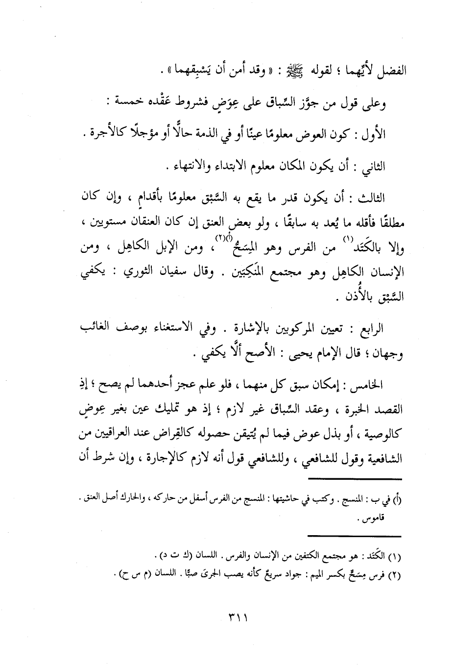 الثالث: أن يكون قدر ما يقع به السَّبق معلومًا بأقدامٍ، وإن كان مطلقًا فأقله ما يُعد به سابقًا، ولو بعض العنق إن كان العنقان مستويين، وإلا بالكَتَد (¬1) من الفرس وهو المِسَحُّ (أ) (¬2)، ومن الإبل الكاهِل، ومن الإنسان الكاهِل وهو مجتمع المنَكِبَين. وقال سفيان الثوري: يكفي السَّبق بالأُذن.