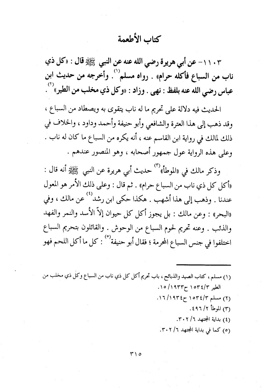 1103 - عن أبي هريرة رضي الله عنه عن النبي - صلى الله عليه وسلم - قال: "كل ذي ناب من السباع فأكله حرام". رواه مسلم (¬1). وأخرجه من حديث ابن عباس رضي الله عنه بلفظ: نهى. وزاد: "وكل ذي مخلب من الطير" (¬2).