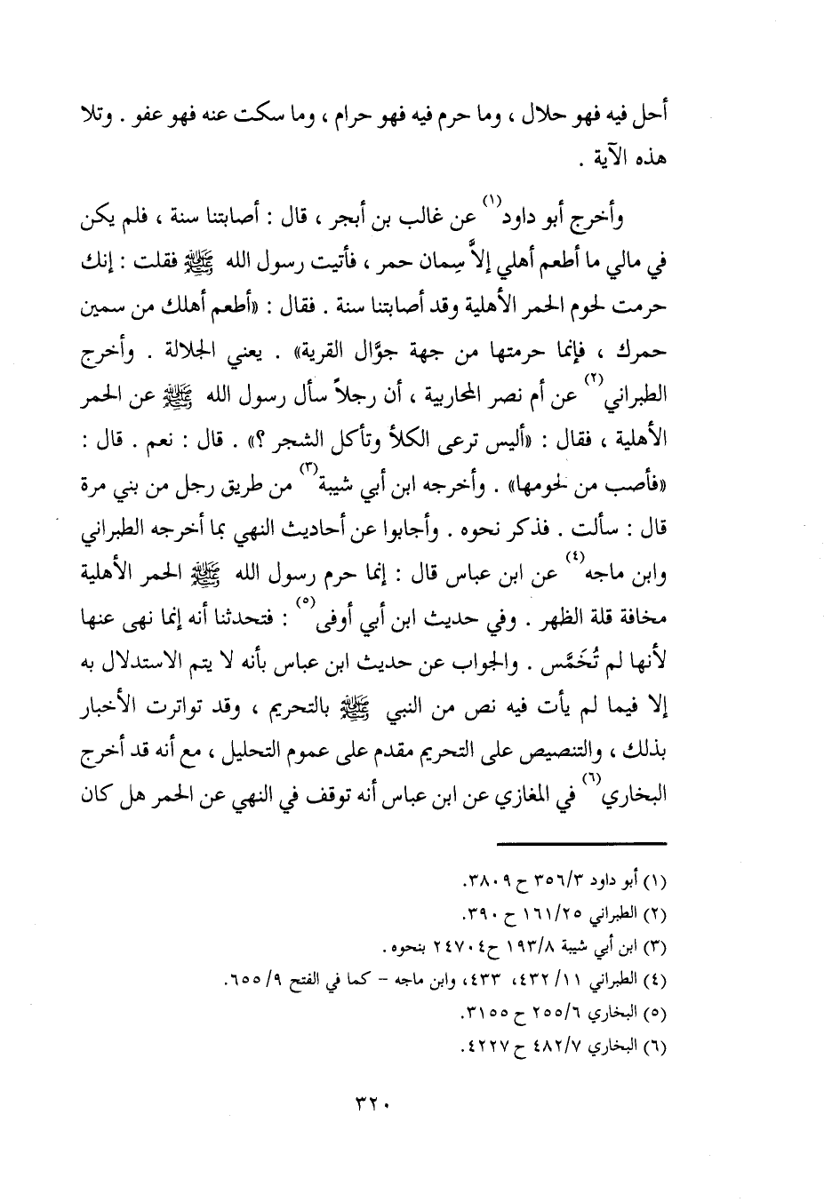 وأخرج أبو داود (¬1) عن غالب بن أبجر، قال: أصابتنا سنة، فلم يكن في مالي ما أطعم أهلي إلَّا سِمان حمر، فأتيت رسول الله - صلى الله عليه وسلم - فقلت: إنك حرمت لحوم الحمر الأهلية وقد أصابتنا سنة. فقال: "أطعم أهلك من سمين حمرك، فإنما حرمتها من جهة جوَّال القرية". يعني الجلالة. وأخرج الطبراني (¬2) عن أم نصر المحاربية، أن رجلًا سأل رسول الله - صلى الله عليه وسلم - عن الحمر الأهلية، فقال: "أليس ترعى الكلأ وتأكل الشجر؟ ". قال: نعم. قال: "فأصب من لحومها". وأخرجه ابن أبي شيبة (¬3) من طريق رجل من بني مرة قال: سألت. فذكر نحوه. وأجابوا عن أحاديث النهي بما أخرجه الطبراني وابن ماجه (¬4) عن ابن عباس قال: إنما حرم رسول الله - صلى الله عليه وسلم - الحمر الأهلية مخافة قلة الظهر. وفي حديث ابن أبي أوفى (¬5): فتحدثنا أنه إنما نهى عنها لأنها لم تُخَمَّس. والجواب عن حديث ابن عباس بأنه لا يتم الاستدلال به إلا فيما لم يأت فيه نص من النبي - صلى الله عليه وسلم - بالتحريم، وقد تواترت الأخبار بذلك، والتنصيص على التحريم مقدم على عموم التحليل، مع أنه قد أخرج البخاري (¬6) في المغازي عن ابن عباس أنه توقف في النهي عن الحمر هل من