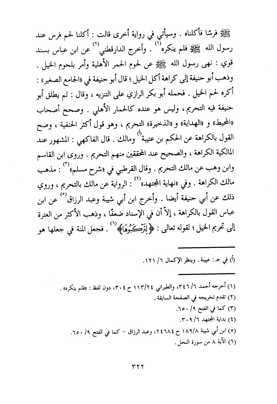 - صلى الله عليه وسلم - فرسًا فأكلناه. وسيأتي في رواية أخرى قالت: أكلنا لحم فرس عند رسول الله - صلى الله عليه وسلم - فلم ينكره (¬1). وأخرج الدارقطني (¬2) عن ابن عباس بسند قوي: نهى رسول الله - صلى الله عليه وسلم - عن لحوم الحمر الأهلية وأمر بلحوم الخيل. وذهب أبو حنيفة إلى كراهة أكل الخيل؛ قال أبو حنيفة في "الجامع الصغير": أكره لحم الخيل. فحمله أبو بكر الرازي على التنزيه، وقال: لم يطلق أبو حنيفة فيه التحريم، وليس هو عنده كالحمار الأهلي. وصحح أصحاب "المحيط" و "الهداية" و "الذخيرة" التحريم، وهو قول أكثر الحنفية، وصح القول بالكراهة عن الحكم بن عتيبة (أ) ومالك. قال الفاكهي: المشهور عند المالكية الكراهة، والصحيح عند المحققين منهم التحريم. وروى ابن القاسم وابن وهب عن مالك التحريم. وقال القرطبي في "شرح مسلم" (¬3): مذهب مالك الكراهة. وفي "نهاية المجتهد" (¬4): الرواية عن مالك بالتحريم، وروي ذلك عن أبي حنيفة أيضًا. وأخرج ابن أبي شيبة وعبد الرزاق (¬5) عن ابن عباس القول بالكراهة، إلّا أن في الإسناد ضعفًا، وذهب الأكثر من العترة إلى تحريم الخيل؛ لقوله تعالى: {لِتَرْكَبُوهَا} (¬6). فجعل المنة في جعلها هو