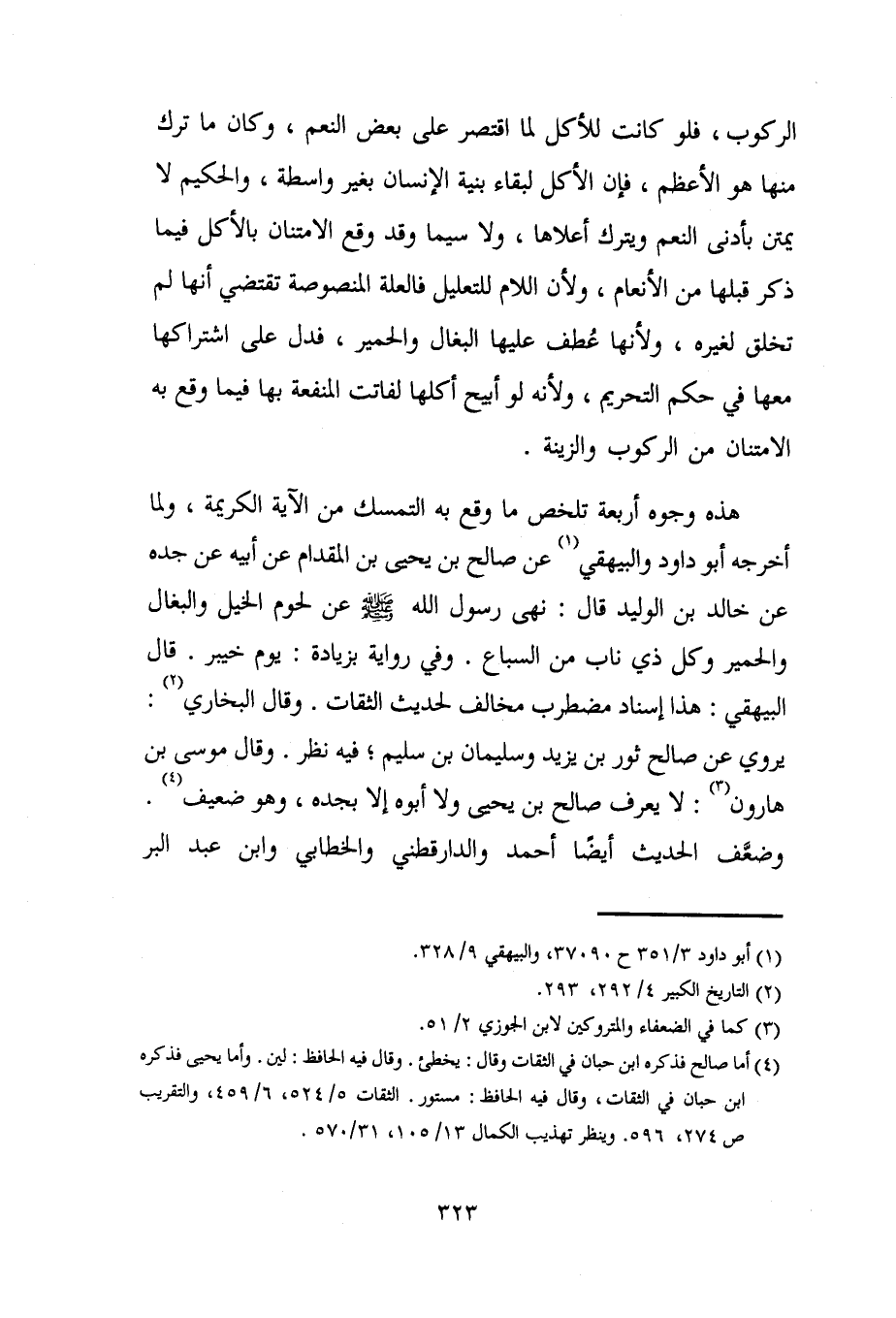 هذه وجوه أربعة تلخص ما وقع به التمسك من الآية الكريمة، ولما أخرجه أبو داود والبيهقي (¬1) عن صالح بن يحيى بن المقدام عن أبيه عن جده عن خالد بن الوليد قال: نهى رسول الله - صلى الله عليه وسلم - عن لحوم الخيل والبغال والحمير وكل ذي ناب من السباع. وفي رواية بزيادة: يوم خيبر. قال البيهقي: هذا إسناد مضطرب مخالف لحديث الثقات. وقال البخاري (¬2): يروي عن صالح ثور بن يزيد وسليمان بن سليم، فيه نظر. وقال موسى بن هارون (¬3): لا يعرف صالح بن يحيى ولا أبوه إلا بجده، وهو ضعيف (¬4).