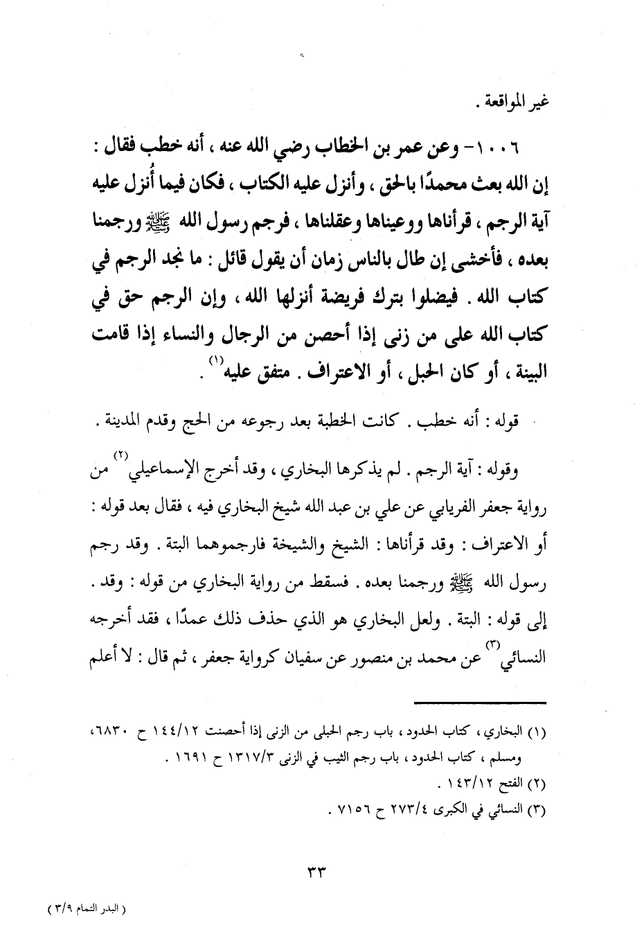 (¬1) البخاري، كتاب الحدود، باب رجم الحبلى من الزنى إذا أحصنت 12/ 144 ح 6830، ومسلم، كتاب الحدود، باب رجم الثيب في الزنى 3/ 1317 ح 1691.