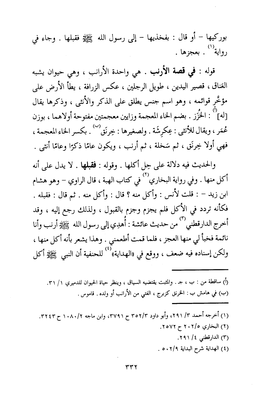 والحديث فيه دلالة على حِل أكلها. وقوله: فقبلها. لا يدل على أنه أكل منها. وفي رواية البخاري (¬2) في كتاب الهبة، قال الراوي -وهو هشام بن زيد-: قلت لأنس: وأكل منه؟ قال: وأكل منه. ثم قال: فقبله. فكأنه تردد في الأكل فلم يجزم وجزم بالقبول، ولذلك رجع إليه، وقد أخرج الدارقطني (¬3) من حديث عائشة: أُهدِي إلى رسول الله - صلى الله عليه وسلم - أرنب وأنا نائمة فخبأ لي منها العجز، فلما قمت أطعمني. وهذا يشعر بأنه أكل منها، ولكن إسناده فيه ضعف، ووقع في "الهداية" (¬4) للحنفية أن النبي - صلى الله عليه وسلم - أكل