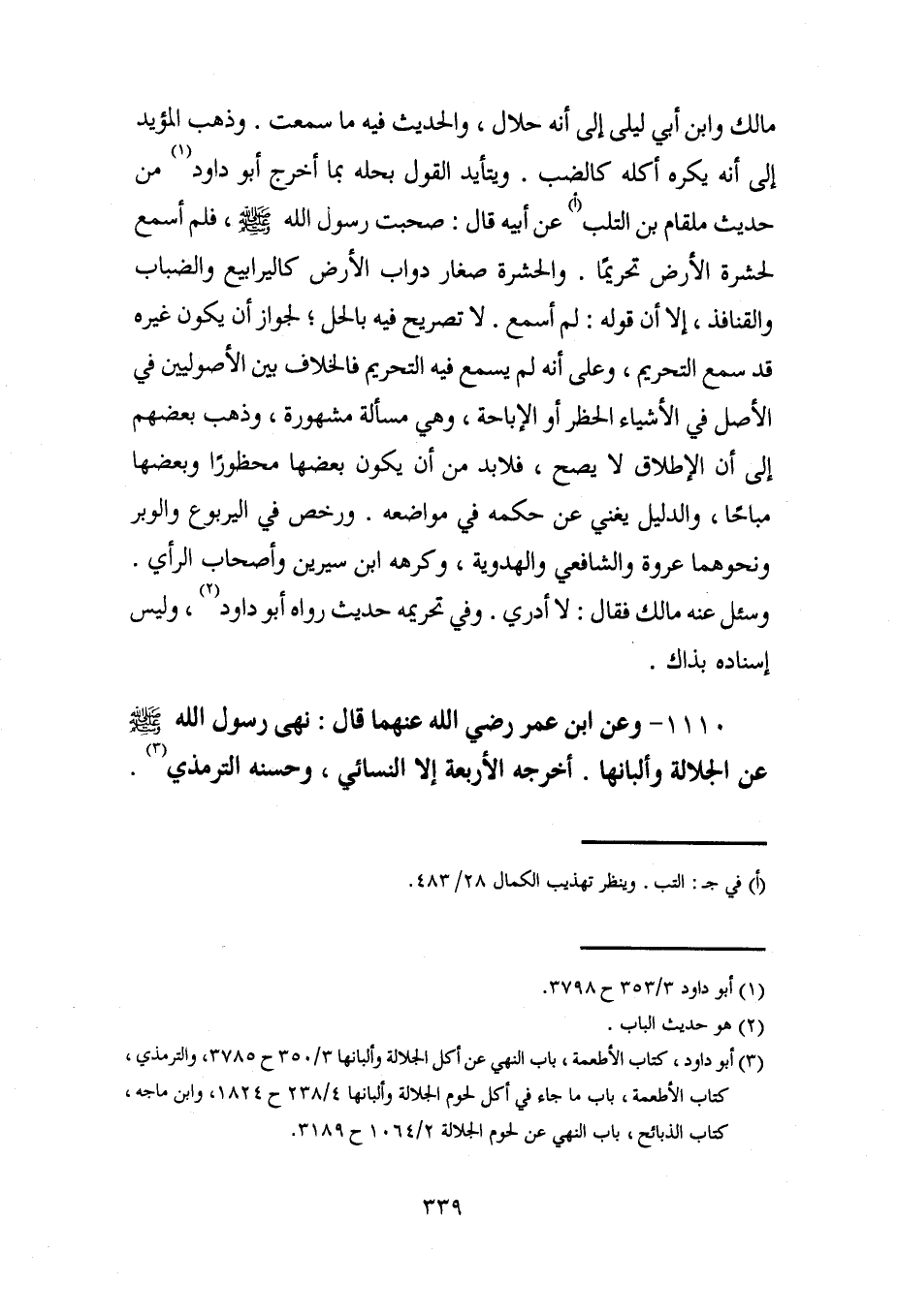 (¬3) أبو داود، كتاب الأطعمة، باب النهي عن أكل الجلالة وألبانها 3/ 350 ح 3785، والترمذي، كتاب الأطعمة، باب ما جاء في أكل لحوم الجلالة وألبانها 4/ 238 ح 1824، وابن ماجه، كتاب الذبائح، باب النهي عن لحوم الجلالة 2/ 1064 ح 3189.
