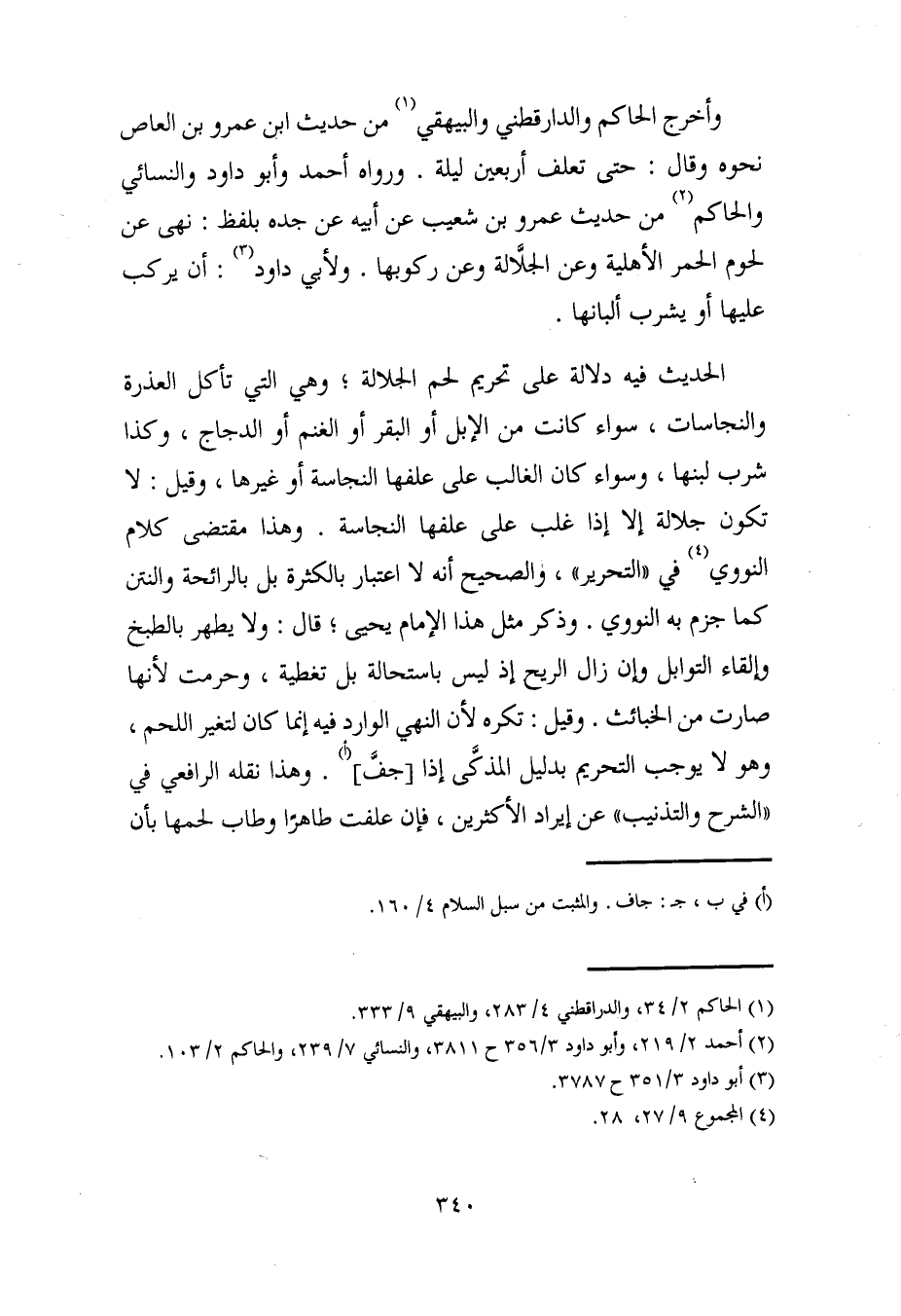 وأخرج الحاكم والدارقطني والبيهقي (¬1) من حديث ابن عمرو بن العاص نحوه وقال: حتى تعلف أربعين ليلة. ورواه أحمد وأبو داود والنسائي والحاكم (¬2) من حديث عمرو بن شعيب عن أبيه عن جده بلفظ: نهى عن لحوم الحمر الأهلية وعن الجلَّالة وعن ركوبها. ولأبي داود (¬3): أن يركب عليها أو يشرب ألبانها.