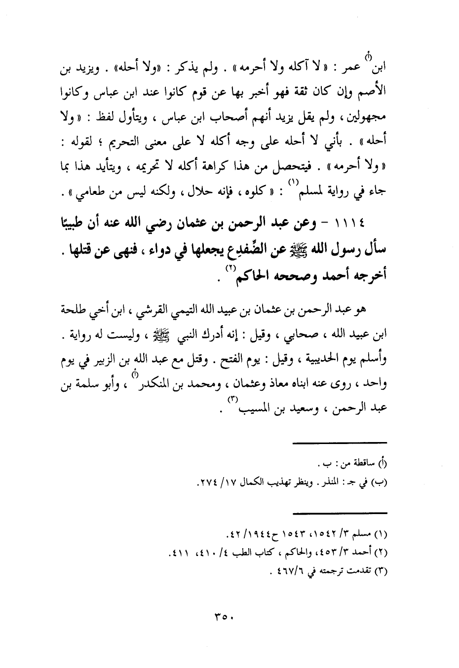 1114 - وعن عبد الرحمن بن عثمان رضي الله عنه أن طبيبًا سأل رسول الله - صلى الله عليه وسلم - عن الضِّفدِع يجعلها في دواء، فنهى عن قتلها. أخرجه أحمد وصححه الحاكم (¬2).