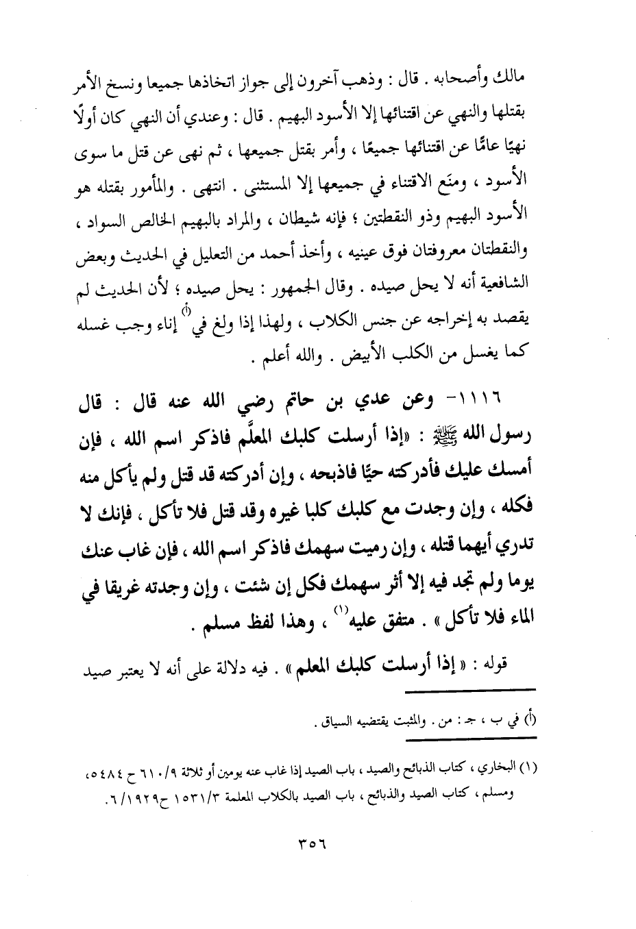 (¬1) البخاري، كتاب الذبائح والصيد، باب الصيد إذا غاب عنه يومين أو ثلاثة 9/ 610 ح 5484، ومسلم، كتاب الصيد والذبائح، باب الصيد بالكلاب المعلمة 3/ 1531 ح 1929/ 6.