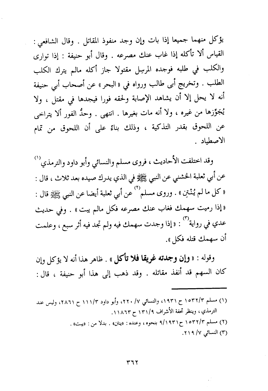 وقد اختلفت الأحاديث، فروى مسلم والنسائي وأبو داود والترمذي (¬1) عن أبي ثعلبة الخشني عن النبي - صلى الله عليه وسلم - في الذي يدرك صيده بعد ثلاث، قال: "كل ما لم يُنْتِن". وروى مسلم (¬2) عن أبي ثعلبة أيضًا عن النبي - صلى الله عليه وسلم - قال: "إذا رميت سهمك فغاب عنك مصرعه فكل ما لم يبت". وفي حديث عدي في رواية (¬3): "إذا وجدت سهمك فيه ولم تجد فيه أثر سبع، وعلمت أن سهمك قتله فكل".