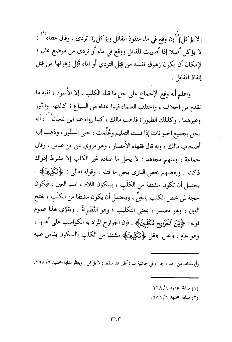 (أ) ساقط من: ب، جـ. وفي حاشية ب: أظن هنا سقط: لا يؤكل. وينظر بداية المجتهد 6/ 268.