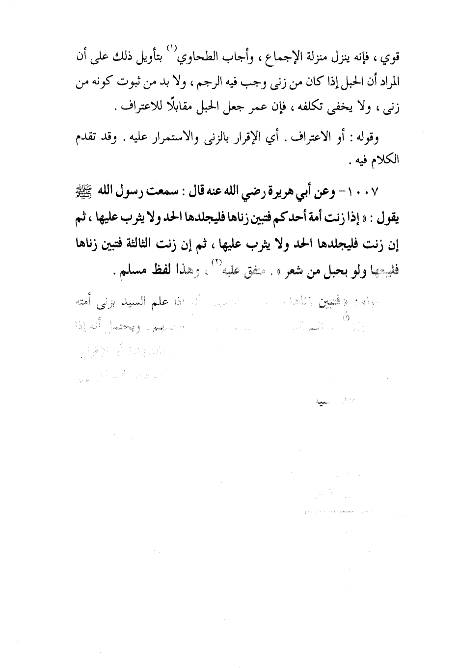 1007 - وعن أبي هريرة رضي الله عنه قال: سمعت رسول الله - صلى الله عليه وسلم - يقول: "إذا زنت أمة أحدكم فتبين زناها فليجلدها الحد ولا يثرب عليها، ثم إن زنت فليجلدها الحد ولا يثرب عليها، ثم إن زنت الثالثة فتبين زناها فليبعها ولو بحبل من شعر".متفق عليه (2) , وهذا لفظ مسلم.