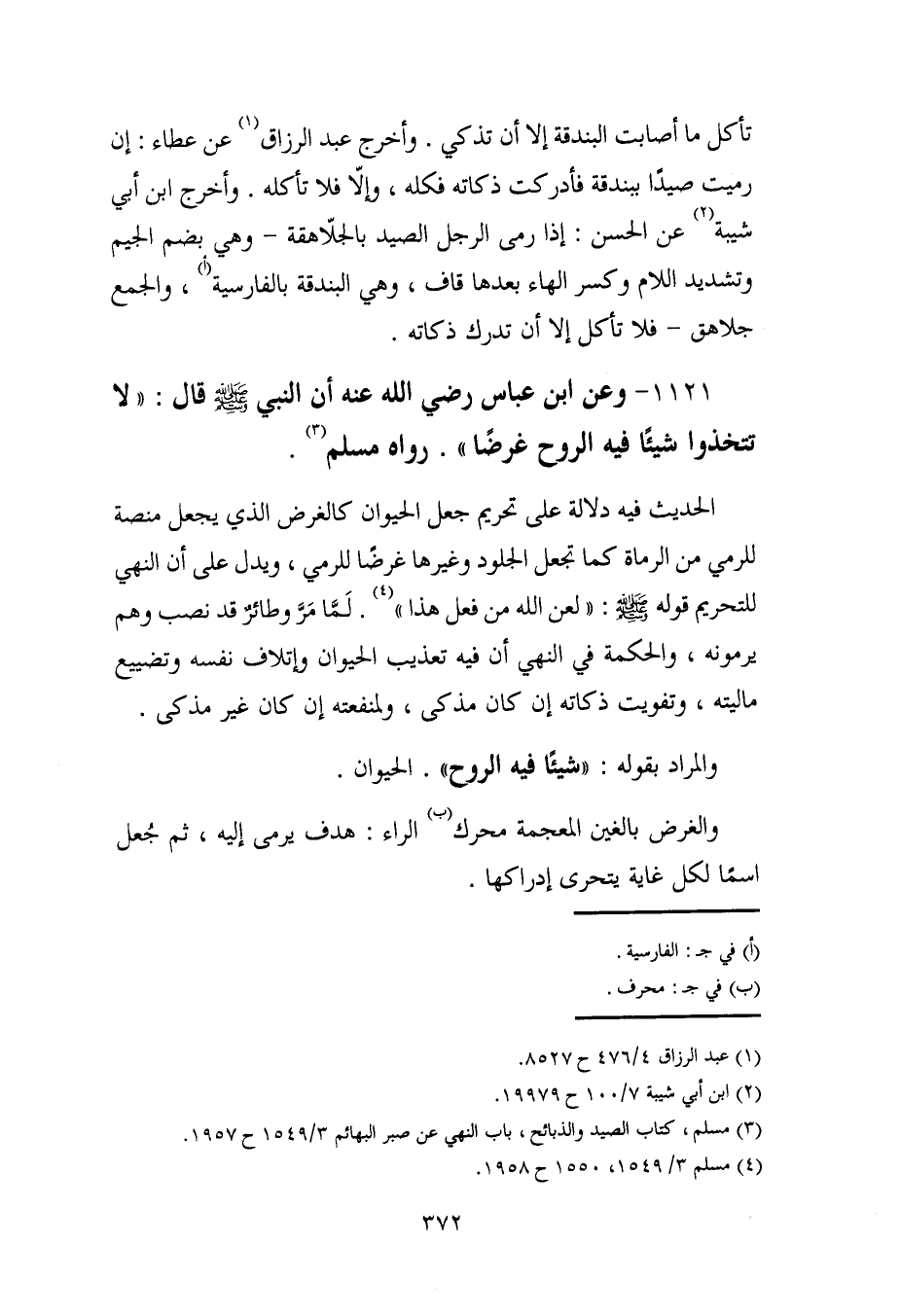 1121 - وعن ابن عباس رضي الله عنه أن النبي - صلى الله عليه وسلم - قال: "لا تتخذوا شيئًا فيه الروح غرضًا". رواه مسلم (¬3).