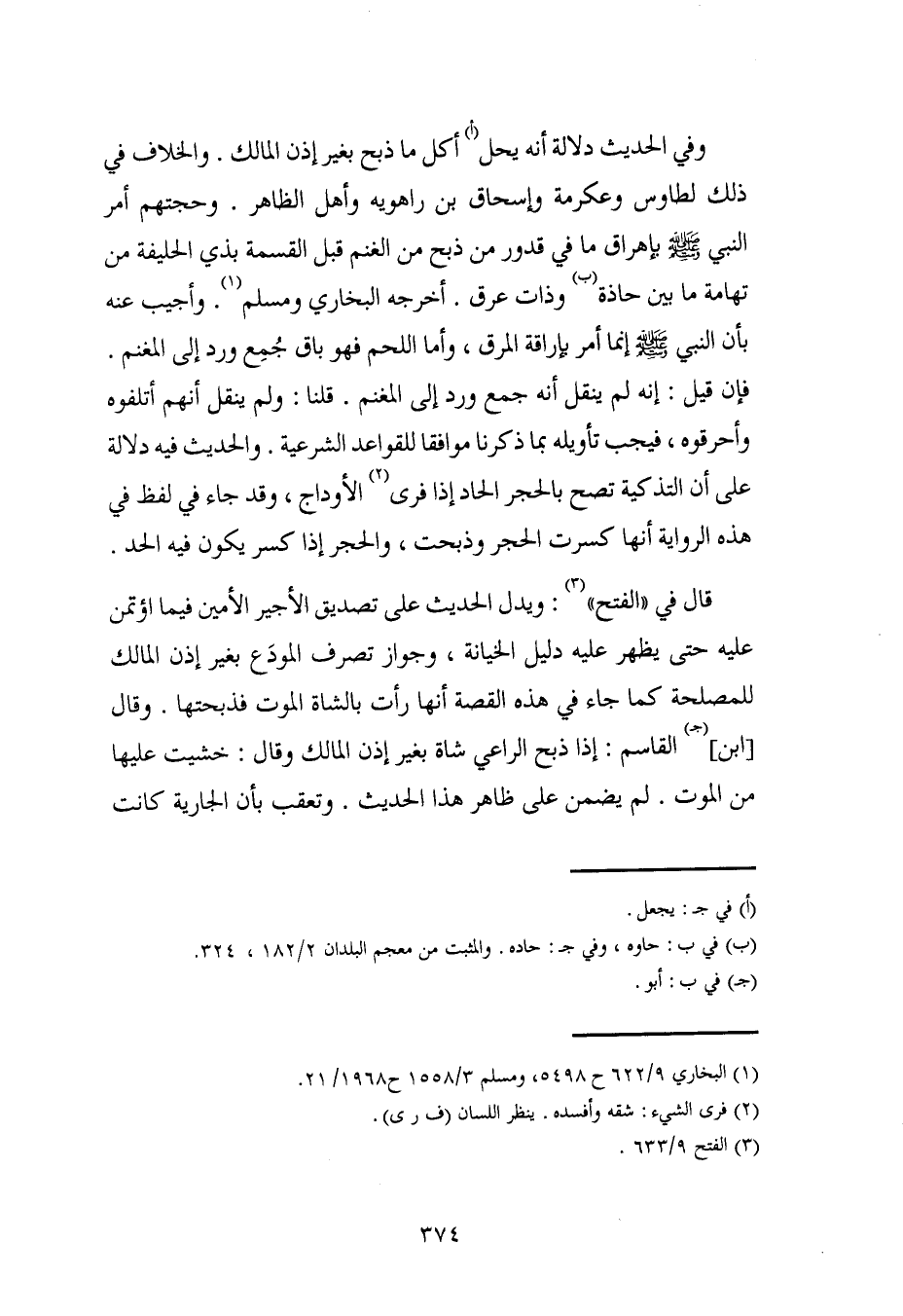 وفي الحديث دلالة أنه يحل (أ) أكل ما ذبح بغير إذن المالك. والخلاف في ذلك لطاوس وعكرمة وإسحاق بن راهويه وأهل الظاهر. وحجتهم أمر النبي - صلى الله عليه وسلم - بإهراق ما في قدور من ذبح من الغنم قبل القسمة بذي الحليفة من تهامة ما بين حاذة (ب) وذات عرق. أخرجه البخاري ومسلم (¬1). وأجيب عنه بأن النبي - صلى الله عليه وسلم - إنما أمر بإراقة المرق، وأما اللحم فهو باق جُمِع ورد إلى المغنم. فإن قيل: إنه لم ينقل أنه جمع ورد إلى المغنم. قلنا: ولم ينقل أنهم أتلفوه وأحرقوه، فيجب تأويله بما ذكرنا موافقا للقواعد الشرعية. والحديث فيه دلالة على أن التذكية تصح بالحجر الحاد إذا فرى (¬2) الأوداج، وقد جاء في لفظ في هذه الرواية أنها كسرت الحجر وذبحت، والحجر إذا كسر يكون فيه الحد.