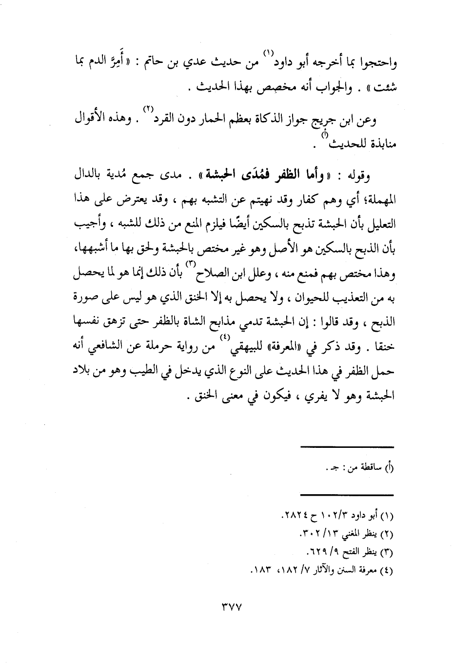 واحتجوا بما أخرجه أبو داود (¬1) من حديث عدي بن حاتم: "أَمِرَّ الدم بما شئت". والجواب أنه مخصص بهذا الحديث.