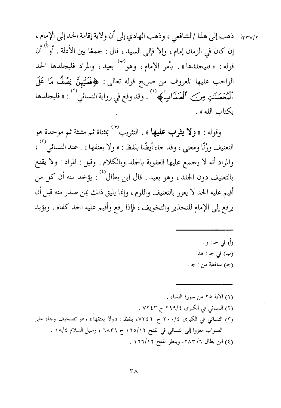 ذهب إلى هذا الشافعي، وذهب الهادي إلى أن ولاية إقامة الحد إلى الإمام، إن كان في الزمان إمام، وإلا فإلى السيد، قال: جمعًا بين الأدلة. أو (أ) أن قوله: "فليجلدها". بأمر الإمام، وهو (ب) بعيد، والمراد فليجلدها الحد الواجب عليها المعروف من صريح قوله تعالى: {فَعَلَيْهِنَّ نِصْفُ مَا عَلَى الْمُحْصَنَاتِ مِنَ الْعَذَابِ} (¬1). وقد وقع في رواية النسائي (¬2): "فليجلدها بكتاب الله".