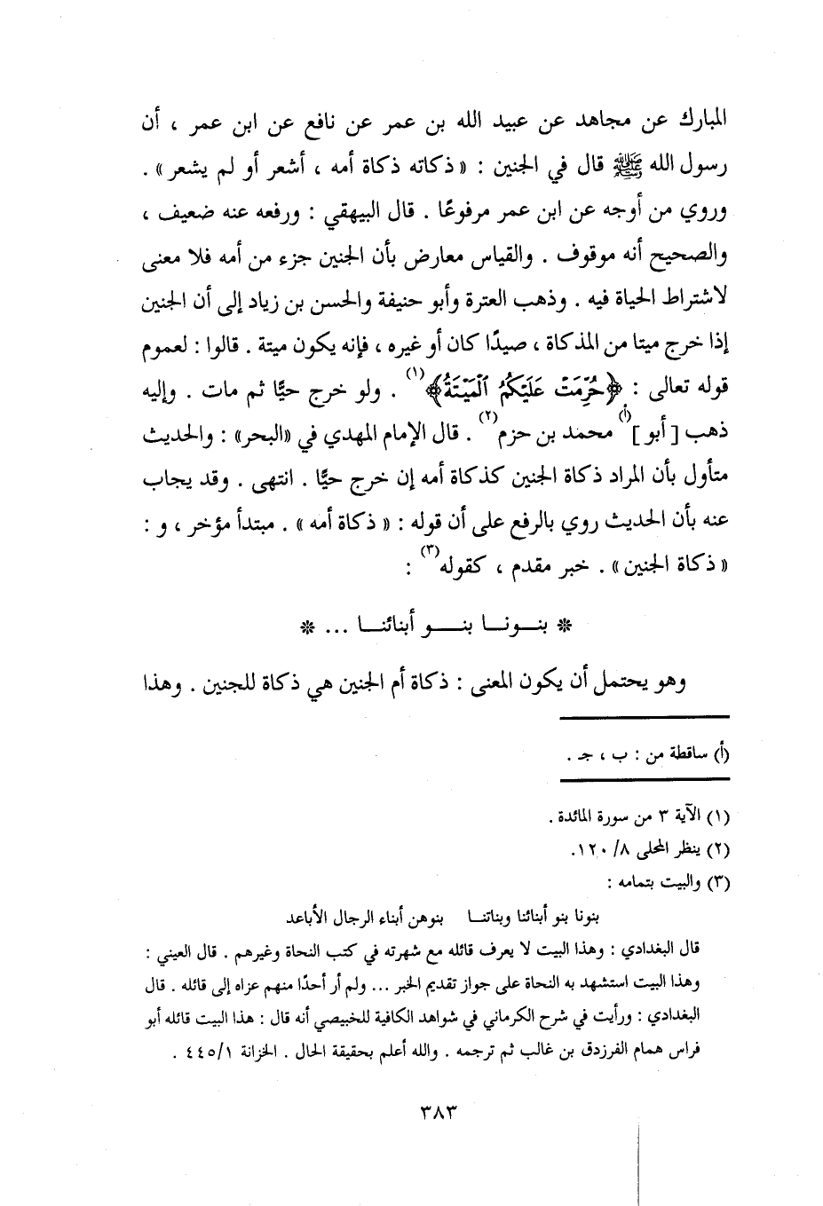 المبارك عن مجاهد عن عبيد الله بن عمر عن نافع عن ابن عمر، أن رسول الله - صلى الله عليه وسلم - قال في الجنين: "ذكاته ذكاة أمه، أشعر أو لم يشعر". وروي من أوجه عن ابن عمر مرفوعًا. قال البيهقي: ورفعه عنه ضعيف، والصحيح أنه موقوف. والقياس معارض بأن الجنين جزء من أمه فلا معنى لاشتراط الحياة فيه. وذهب العترة وأبو حنيفة والحسن بن زياد إلى أن الجنين إذا خرج ميتا من المذكاة، صيدًا كان أو غيره، فإنه يكون ميتة. قالوا: لعموم قوله تعالى: {حُرِّمَتْ عَلَيْكُمُ الْمَيْتَةُ} (¬1). ولو خرج حيّا ثم مات. وإليه ذهب [أبو] (أ) محمد بن حزم (¬2). قال الإمام المهدي في "البحر": والحديث متأول بأن المراد ذكاة الجنين كذكاة أمه إن خرج حيًّا. انتهى. وقد يجاب عنه بأن الحديث روي بالرفع على أن قوله: "ذكاة أمه". مبتدأ مؤخر، و: "ذكاة الجنين". خبر مقدم، كقوله (¬3):
