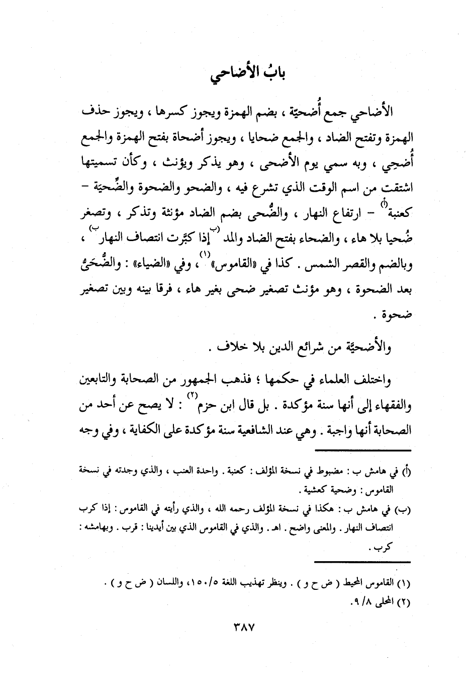 الأضاحي جمع أُضحيّة، بضم الهمزة ويجوز كسرها، ويجوز حذف الهمزة وتفتح الضاد، والجمع ضحايا، ويجوز أضحاة بفتح الهمزة والجمع أُضحِي، وبه سمي يوم الأضحى، وهو يذكر ويؤنث، وكأن تسميتها اشتقت من اسم الوقت الذي تشرع فيه، والضحو والضحوة والضحيَة -كعنبة (أ) - ارتفاع النهار، والضحى بضم الضاد مؤنثة وتذكر، وتصغر ضُحيا بلا هاء، والضحاء بفتح الضاد والمد (ب إذا كبَّرت انتصاف النهار ب)، وبالضم والقصر الشمس. كذا في "القاموس" (¬1)، وفي "الضياء": والضُّحَي بعد الضحوة، وهو مؤنث تصغير ضحى بغير هاء، فرقا بينه وبين تصغير ضحوة.