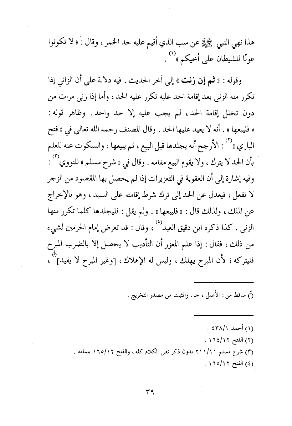 وقوله: "ثم إن زنت" إلى آخر الحديث. فيه دلالة على أن الزاني إذا تكرر منه الزنى بعد إقامة الحد عليه تكرر عليه الحد، وأما إذا زنى مرات من دون تخلل إقامة الحد، لم يجب عليه إلا حد واحد. وظاهر قوله: "فليبعها". أنه لا يعيد عليها الحد. وقال المصنف رحمه الله تعالى في "فتح الباري" (¬2): الأرجح أنه يجلدها قبل البيع، ثم يبيعها، والسكوت عنه للعلم بأن الحد لا يترك، ولا يقوم البيع مقامه. وقال في "شرح مسلم" للنووي (¬3): وفيه إشارة إلى أن العقوبة في التعزيرات إذا لم يحصل بها المقصود من الزجر لا تفعل، فيعدل عن الحد إلى ترك شرط إقامته على السيد، وهو بالإخراج عن الملك، ولذلك قال: "فليبعها". ولم يقل: فليجلدها كلما تكرر منها الزنى. كذا ذكره ابن دقيق العيد (¬4)، وقال: قد تعرض إمام الحرمين لشيء من ذلك، فقال: إذا علم المعزر أن التأديب لا يحصل إلا بالضرب المبرح فليتركه؛ لأن المبرح يهلك، وليس له الإهلاك، [وغير المبرح لا يفيد] (أ)،