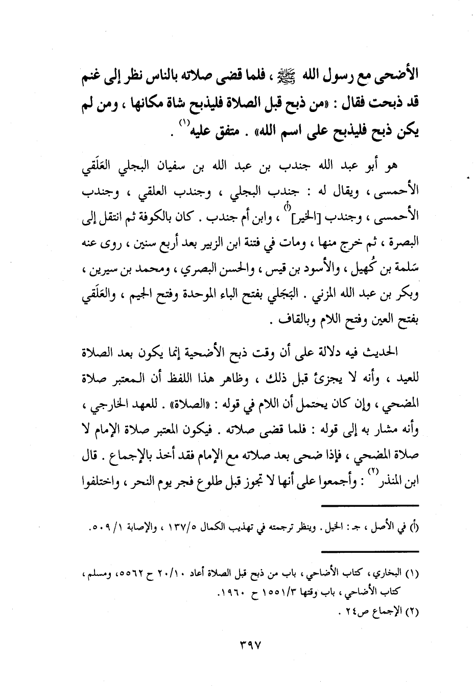 (¬1) البخاري، كتاب الأضاحي، باب من ذبح قبل الصلاة أعاد 10/ 20 ح 5562، ومسلم، كتاب الأضاحي، باب وقتها 3/ 1551 ح 1960.