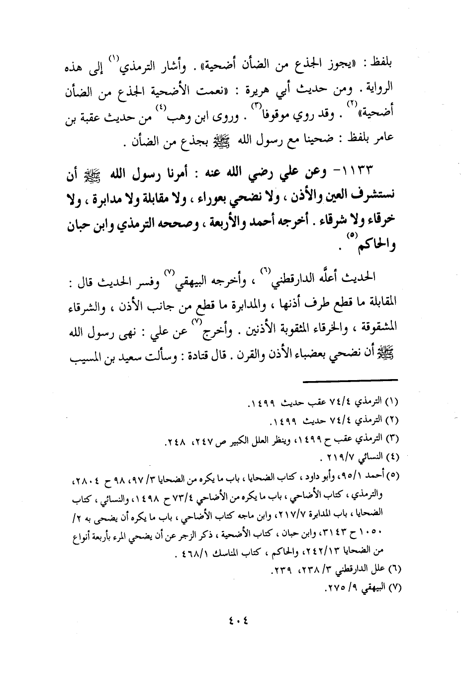 1133 - وعن علي رضي الله عنه: أمرنا رسول الله - صلى الله عليه وسلم - أن نستشرف العين والأذن، ولا نضحي بعوراء، ولا مقابلة ولا مدابرة، ولا خرقاء ولا شرقاء. أخرجه أحمد والأربعة، وصححه الترمذي وابن حبان والحاكم (¬5).