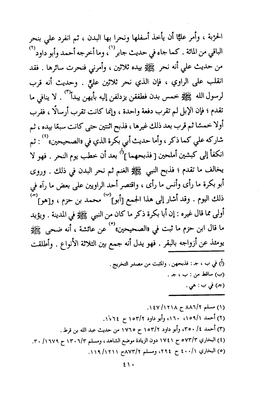 الحزبة، وأمر عليًّا أن يأخذ أسفلها ونحرا بها البدن، ثم انفرد علي بنحر الباقي من المائة. كما جاء في حديث جابر (¬1)، وما أخرجه أحمد وأبو داود (¬2) من حديث علي أنه نحر - صلى الله عليه وسلم - ييده ثلاثين، وأمرني فنحرت سائرها. فقد انقلب على الراوي، فإن الذي نحر ثلاثين علي. وحديث أنه قرب لرسول الله - صلى الله عليه وسلم - خمس بدن فطفقن يزدلفن إليه بأيهن يبدأ (¬3). لا ينافي ما تقدم؛ فإن الإبل لم تقرب دفعة واحدة، وإنما كانت تقرب أرسالًا، فقرب أولًا خمسًا ثم قرب بعد ذلك غيرها، فذبح ائنتين حتى كانت سبعًا بيده، ثم شاركه علي كما ذكر، وأما حديث أبي بكرة الذي في "الصحيحين" (¬4): ثم انكفأ إلى كبشين أملحين [فذبحهما] (أ) بعد أن خطب يوم النحر. فهو لا يخالف ما تقدم؛ فذبح النبي - صلى الله عليه وسلم - الغنم ثم نحر البدن في ذلك. وروى أبو بكرة ما رأى وأنس ما رأى، واقتصر أحد الراويين على بعض ما رآه في ذلك اليوم. وقد أشار إلى هذا الجمع [أبو] (ب) محمد بن حزم، و [هو] (جـ) أولى مما قال غيره: إن أبا بكرة ذكر ما كان من النبي - صلى الله عليه وسلم - في المدينة. ويؤيد ما قال ابن حزم ما ثبت في "الصحيحين" (¬5) عن عائشة، أنه ضحى - صلى الله عليه وسلم - يؤمئذ عن أزواجه بالبقر. فهو يدل أنه جمع بين الثلاثة الأنواع. وأطلقت