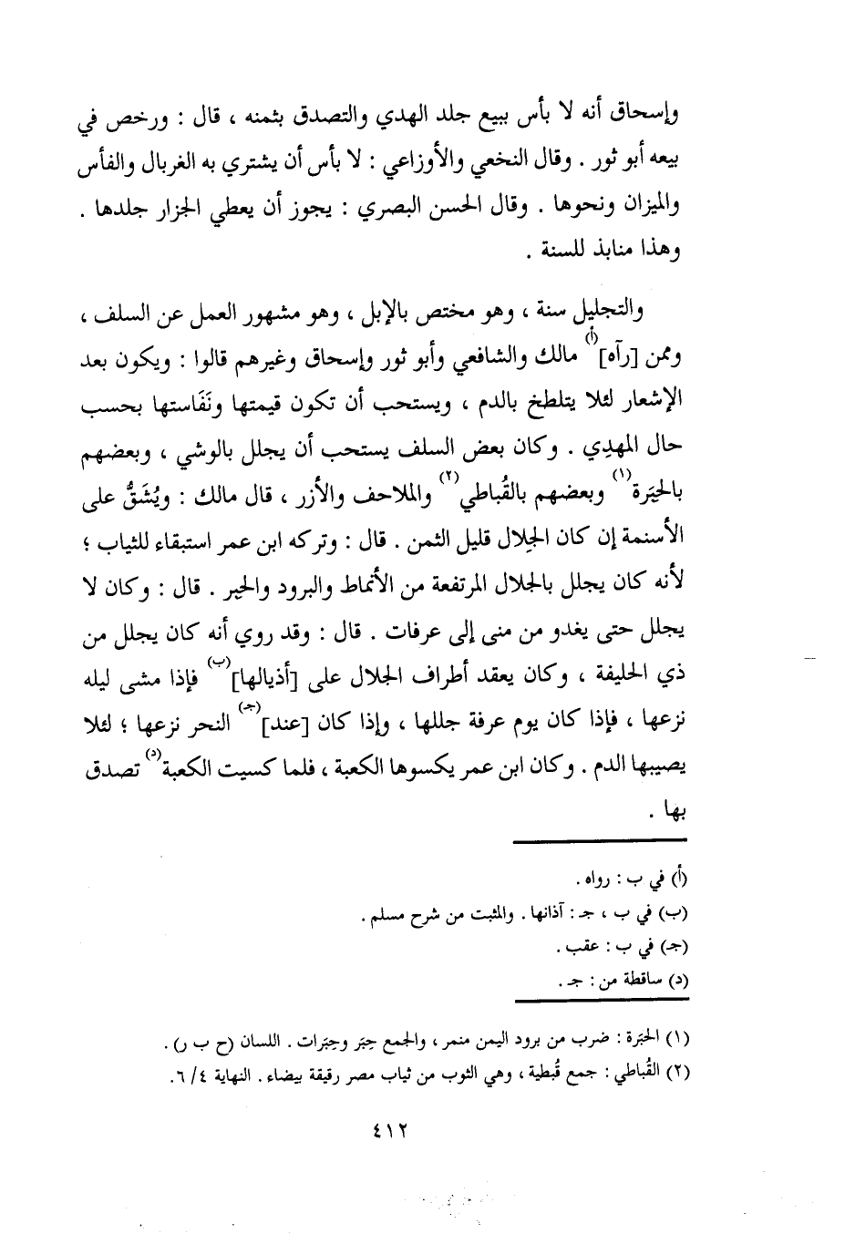 والتجليل سنة، وهو مختص بالإبل، وهو مشهور العمل عن السلف، وممن [رآه] (أ) مالك والشافعي وأبو ثور وإسحاق وغيرهم قالوا: ويكون بعد الإشعار لئلا يتلطخ بالدم، ويستحب أن تكون قيمتها ونَفَاستها بحسب حال المهدِي. وكان بعض السلف يستحب أن يجلل بالوشي، وبعضهم بالحيرَة (¬1) وبعضهم بالقُباطي (¬2) والملاحف والأزر، قال مالك: ويُشَقُّ على الأسنمة إن كان الجِلال قليل الثمن. قال: وتركه ابن عمر استبقاء للثياب، لأنه كان يجلل بالجلال المرتفعة من الأنماط والبرود والحير. قال: وكان لا يجلل حتى يغدو من منى إلى عرفات. قال: وقد روي أنه كان يجلل من ذي الحليفة، وكان يعقد أطراف الجلال على [أذيالها] (ب) فإذا مشى ليله نزعها، فإذا كان يوم عرفة جللها، وإذا كان [عند] (جـ) النحر نزعها؛ لئلا يصيبها الدم. وكان ابن عمر يكسوها الكعبة، فلما كسيت الكعبة (د) تصدق بها.