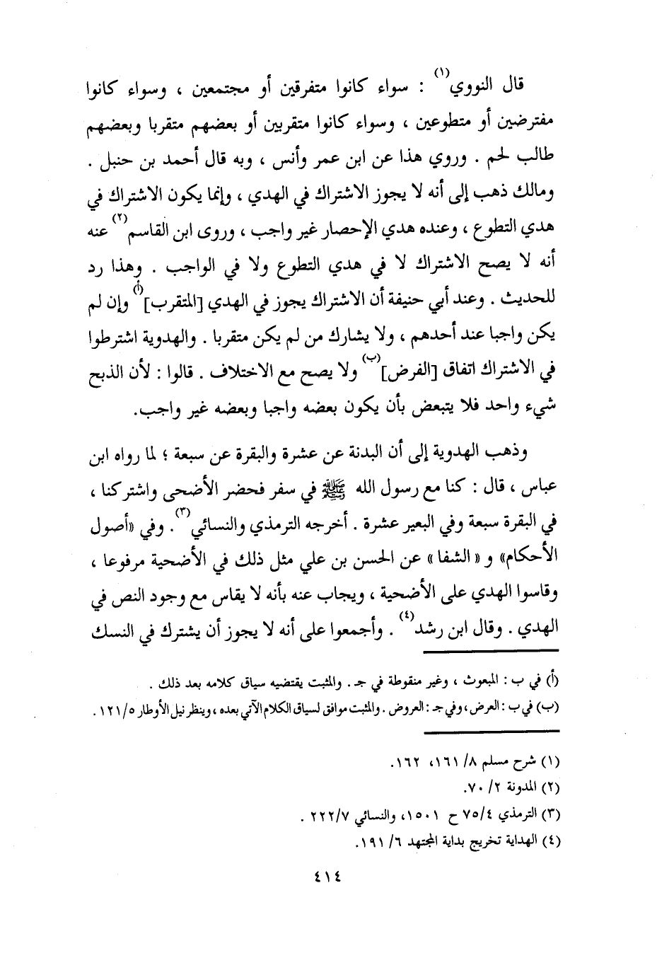 قال النووي (¬1): سواء كانوا متفرقين أو مجتمعين، وسواء كانوا مفترضين أو متطوعين، وسواء كانوا متقربين أو بعضهم متقربا وبعضهم طالب لحم. وروي هذا عن ابن عمر وأنس، وبه قال أحمد بن حنبل. ومالك ذهب إلى أنه لا يجوز الاشتراك في الهدي، وإنما يكون الاشتراك في هدي التطوع، وعنده هدي الإحصار غير واجب، وروى ابن القاسم (¬2) عنه أنَّه لا يصح الاشتراك لا في هدي التطوع ولا في الواجب. وهذا رد للحديث. وعند أبي حنيفة أن الاشتراك يجوز في الهدي [المتقرب] (أ) وإن لم يكن واجبا عند أحدهم، ولا يشارك من لم يكن متقربا. والهدوية اشترطوا في الاشتراك اتفاق [الفرض] (ب) ولا يصح مع الاختلاف. قالوا: لأن الذبح شيء واحد فلا يتبعض بأن يكون بعضه واجبا وبعضه غير واجب.
