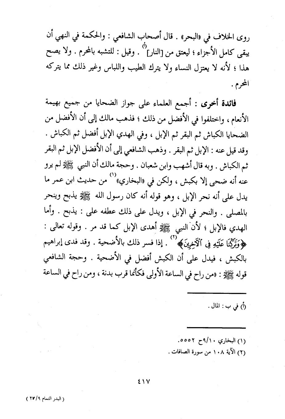 فائدة أخرى: أجمع العلماء على جواز الضحايا من جميع بهيمة الأنعام، واختلفوا في الأفضل من ذلك؛ فذهب مالك إلى أن الأفضل من الضحايا الكباش ثم البقر ثم الإبل، وفي الهدي الإبل أفضل ثم الكباش. وقد قيل عنه: الإبل ثم البقر. وذهب الشافعي إلى أن الأفضل الإبل ثم البقر ثم الكباش. وبه قال أشهب وابن شعبان. وحجة مالك أن النبي - صلى الله عليه وسلم - لم يرو عنه أنَّه ضحى إلا بكبش، ولكن في "البخاري" (¬1) من حديث ابن عمر ما يدل على أنه نحر الإبل، وهو قوله أنه كان رسول الله - صلى الله عليه وسلم - يذبح وينحر بالمصلى. والنحر في الإبل، ويدل على ذلك عطفه على: يذبح. وأما الهدي فالإبل؛ لأنَّ النبي - صلى الله عليه وسلم - أهدى الإبل كما قد مر. وقوله تعالى: {وَتَرَكْنَا عَلَيْهِ فِي الْآخِرِينَ} (¬2). إذا فسر ذلك بالأضحية. وقد فدى إبراهيم بالكبش، فيدل على أن الكبش أفضل في الأضحية. وحجة الشافعي قوله - صلى الله عليه وسلم -: "من راح في الساعة الأولى فكأنما قرب بدنة، ومن راح في الساعة