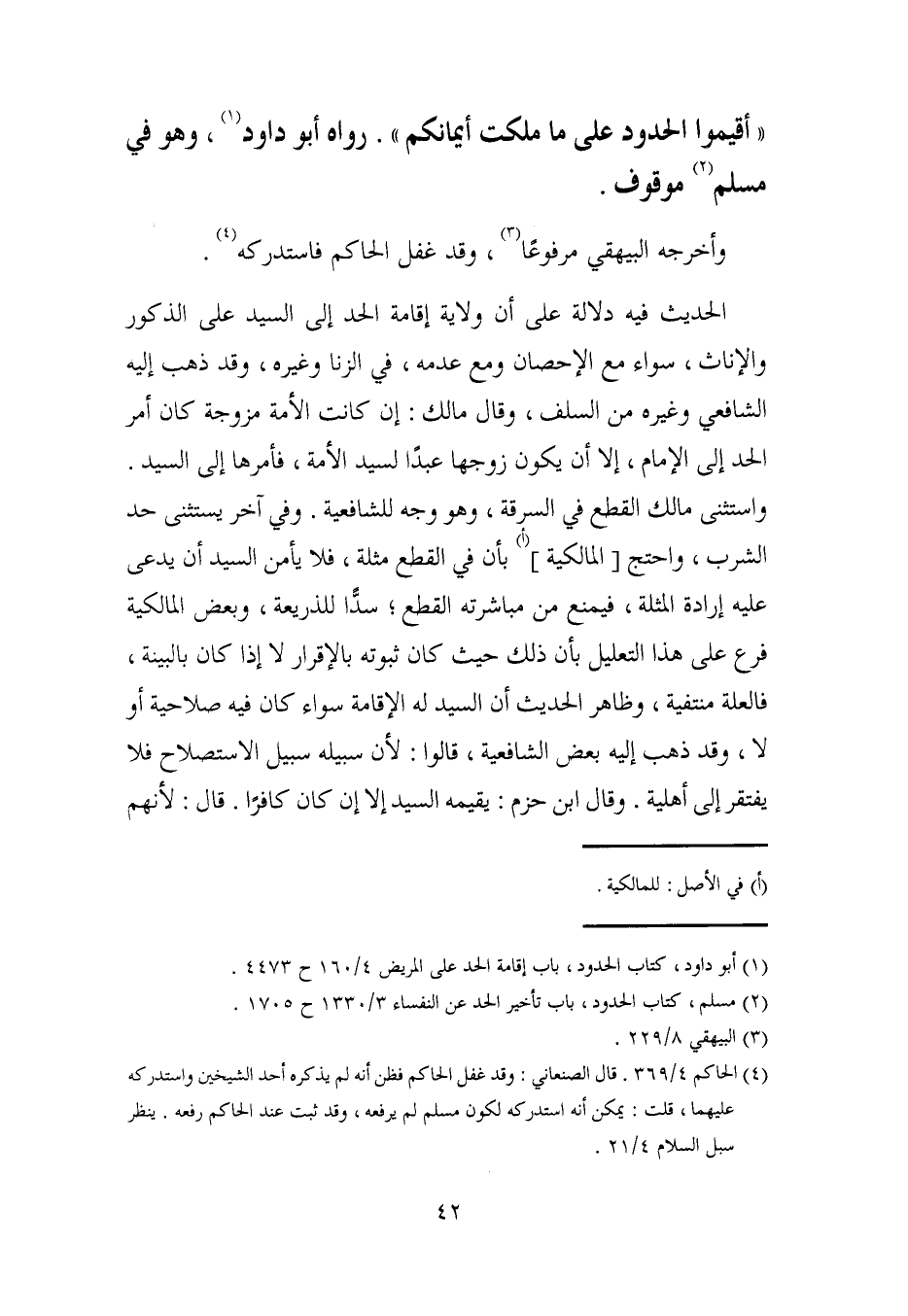 "أقيموا الحدود على ما ملكت أيمانكم". رواه أبو داود (¬1)، وهو في مسلم (¬2) موقوف.