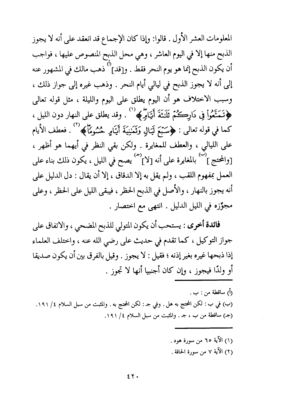 المعلومات العشر الأول. قالوا: وإذا كان الإجماع قد انعقد على أنه لا يجوز الذبح منها إلا في اليوم العاشر، وهي محل الذبح المنصوص عليها، فواجب أن يكون الذبح إنما هو يوم النحر فقط. و [قد] (أ) ذهب مالك في المشهور عنه إلى أنه لا يجوز الذبح في ليالي أيام النحر. وذهب غيره إلى جواز ذلك، وسبب الاختلاف هو أن اليوم يطلق على اليوم والليلة، مثل قوله تعالى {تَمَتَّعُوا فِي دَارِكُمْ ثَلَاثَةَ أَيَّامٍ} (¬1). وقد يطلق على النهار دون الليل، كما في قوله تعالى: {سَبْعَ لَيَالٍ وَثَمَانِيَةَ أَيَّامٍ حُسُومًا} (¬2). فعطف الأيام على الليالي، والعطف للمغايرة. ولكن بقي النظر في أيهما هو أظهر، [والمحتج] (ب) بالمغايرة على أنَّه [لا] (جـ) يصح في الليل، يكون ذلك بناء على العمل بمفهوم اللقب، ولم يقل به إلا الدقاق، إلا أن يقال: دل الدليل على أنَّه يجوز بالنهار، والأصل في الذبح الحظر، فيبقى الليل على الحظر، وعلى مجوِّزه في الليل الدليل. انتهى مع اختصار.