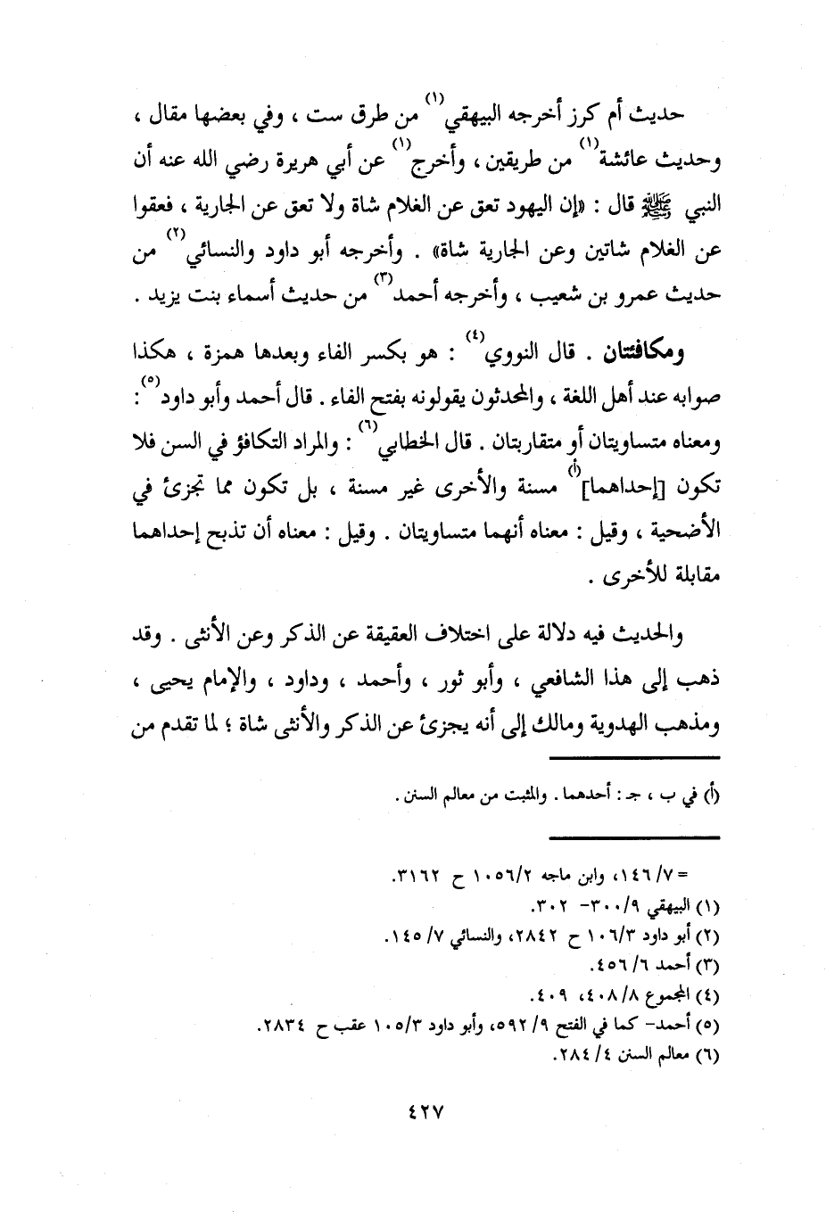 ومكافئتان. قال النووي (¬4): هو بكسر الفاء وبعدها همزة، هكذا صوابه عند أهل اللغة، والمحدثون يقولونه بفتح الفاء. قال أحمد وأبو داود (¬5): ومعناه متساويتان أو متقاربتان. قال الخطابي (¬6): والمراد التكافؤ في السن فلا تكون [إحداهما] (أ) مسنة والأخرى غير مسنة، بل تكون مما تجزئ في الأضحية، وقيل: معناه أنهما متساويتان. وقيل: معناه أن تذبح إحداهما مقابلة للأخرى.