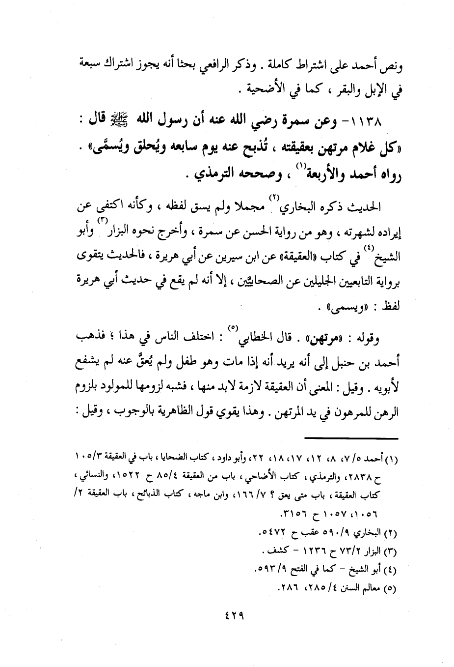 (¬1) أحمد 5/ 7، 8، 12، 17، 18، 22، وأبو داود، كتاب الضحايا، باب في العقيقة 3/ 105 ح 2838، والترمذي، كتاب الأضاحي، باب من العقيقة 4/ 85 ح 1522، والنسائي، كتاب العقيقة، باب متى يعق؟ 7/ 166، وابن ماجه، كتاب الذبائح، باب العقيقة 2/ 1056، 1057 ح 3156.