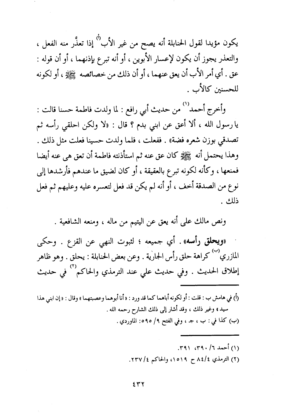 وأخرج أحمد (¬1) من حديث أبي رافع: لما ولدت فاطمة حسنا قالت: يا رسول الله، ألا أعق عن ابني بدم؟ قال: "لا ولكن احلقي رأسه ثم تصدقي بوزن شعره فضة". ففعلت، فلما ولدت حسينا فعلت مثل ذلك. وهذا يحتمل أنه - صلى الله عليه وسلم - كان عق عنه ثم استأذنته فاطمة أن تعق هي عنه أيضًا فمنعها، وكأنه لكونه تبرع بالعقيقة، أو كان لضيق ما عندهم فأرشدها إلى نوع من الصدقة أخف، أو أنه لم يكن قد فعل لتعسره عليه وعليهم ثم فعل ذلك.