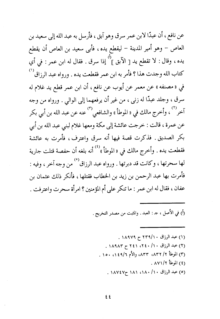 عن نافع، أن عبدًا لابن عمر سرق وهو آبق، فأرسل به عبد الله إلى سعيد بن العاص -وهو أمير المدينة- ليقطع يده، فأبى سعيد بن العاص أن يقطع يده، وقال: لا تقطع يد [الآبق] (أ) إذا سرق. فقال له ابن عمر: في أي كتاب الله وجدت هذا؟ فأمر به ابن عمر فقطعت يده. ورواه عبد الرزاق (¬1) في "مصنفه" عن معمر عن أيوب عن نافع، أن ابن عمر قطع يد غلام له سرق، وجلد عبدًا له زنى، من غير أن يرفعهما إلى الوالي. ورواه من وجه آخر (¬2)، وأخرج مالك في "الموطأ" والشافعي (¬3) عنه عن عبد الله بن أبي بكر عن عمرة، قالت: خرجت عائشة إلى مكة ومعها غلام لبني عبد الله بن أبي بكر الصديق. فذكرت قصة فيها أنه سرق واعترف، فأمرت به عائشة فقطعت يده. وأخرج مالك في "الموطأ" (¬4) أنه بلغه أن حفصة قتلت جارية لها سحرتها، وكانت قد دبرتها. ورواه عبد الرزاق (¬5) من وجه آخر، وفيه: فأمرت بها عبد الرحمن بن زيد بن الخطاب فقتلها، فأنكر ذلك عثمان بن عفان، فقال له ابن عمر: ما تنكر على أم المؤمنين؟ امرأة سحرت واعترفت.