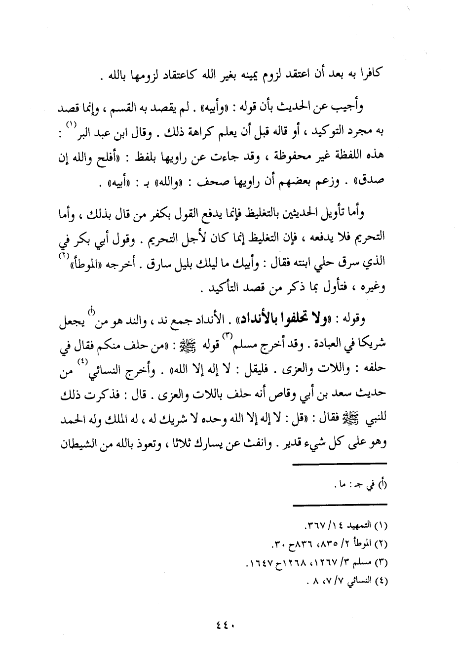 وقوله: "ولا تحلفوا بالأنداد". الأنداد جمع ند، والند هو من (أ) يجعل شريكا في العبادة. وقد أخرج مسلم (¬3) قوله - صلى الله عليه وسلم -: "من حلف منكم فقال في حلفه: واللات والعزى. فليقل: لا إله إلا الله". وأخرج النسائي (¬4) من حديث سعد بن أبي وقاص أنه حلف باللات والعزى. قال: فذكرت ذلك للنبي - صلى الله عليه وسلم - فقال: "قل: لا إله إلا الله وحده لا شريك له، له الملك وله الحمد وهو على كل شيء قدير. وانفث عن يسارك ثلاثا، وتعوذ بالله من الشيطان