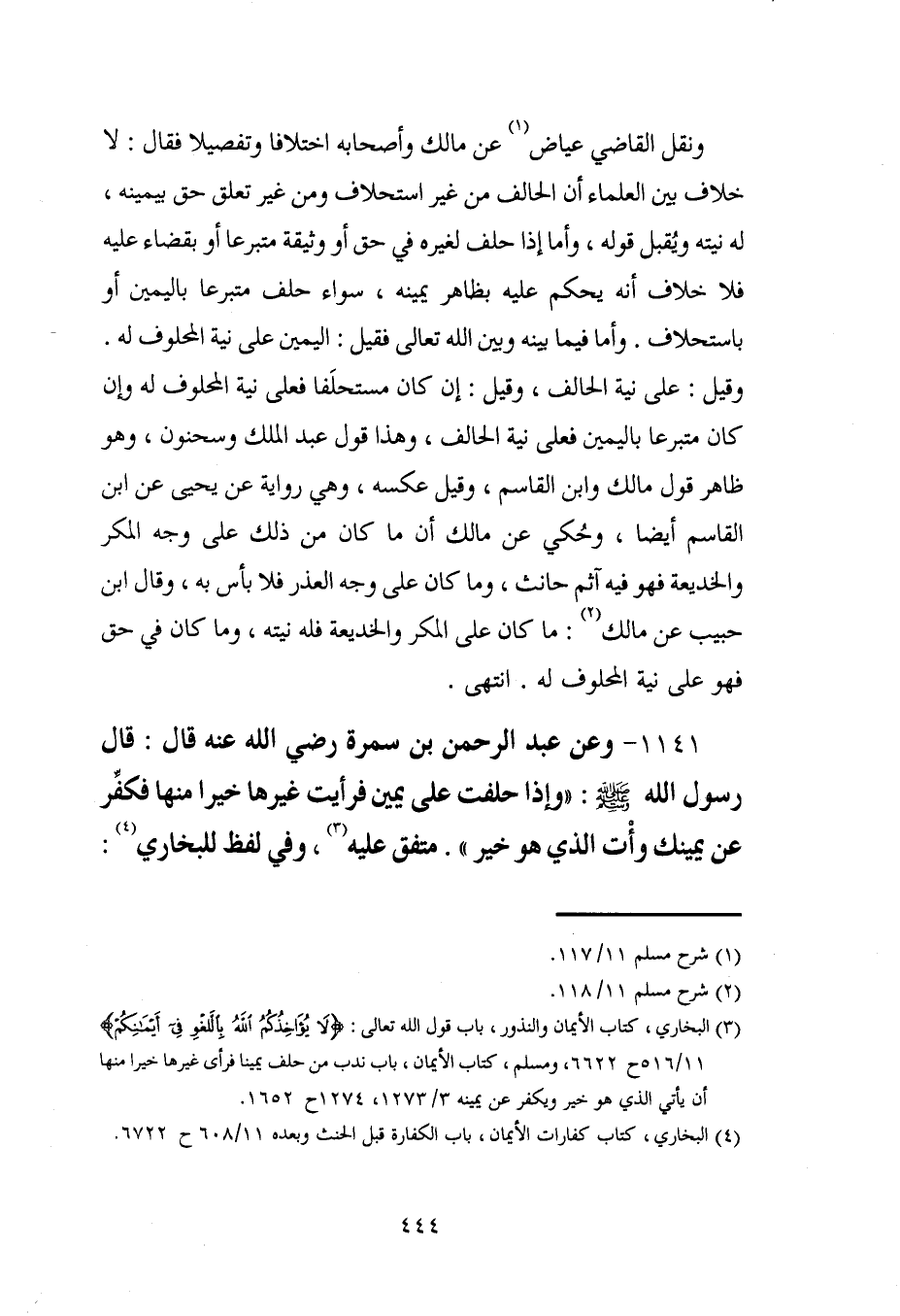 (¬3) البخاري، كتاب الأيمان والنذور، باب قول الله تعالى: {لَا يُؤَاخِذُكُمُ اللَّهُ بِاللَّغْو فِي أَيْمَانِكُمْ} 11/ 516 ح 6622، ومسلم، كتاب الأيمان، باب ندب من حلف يمينا فرأى غيرها خيرا منها أن يأتي الذي هو خير ويكفر عن يمينه 3/ 1273، 1274 ح 1652.
