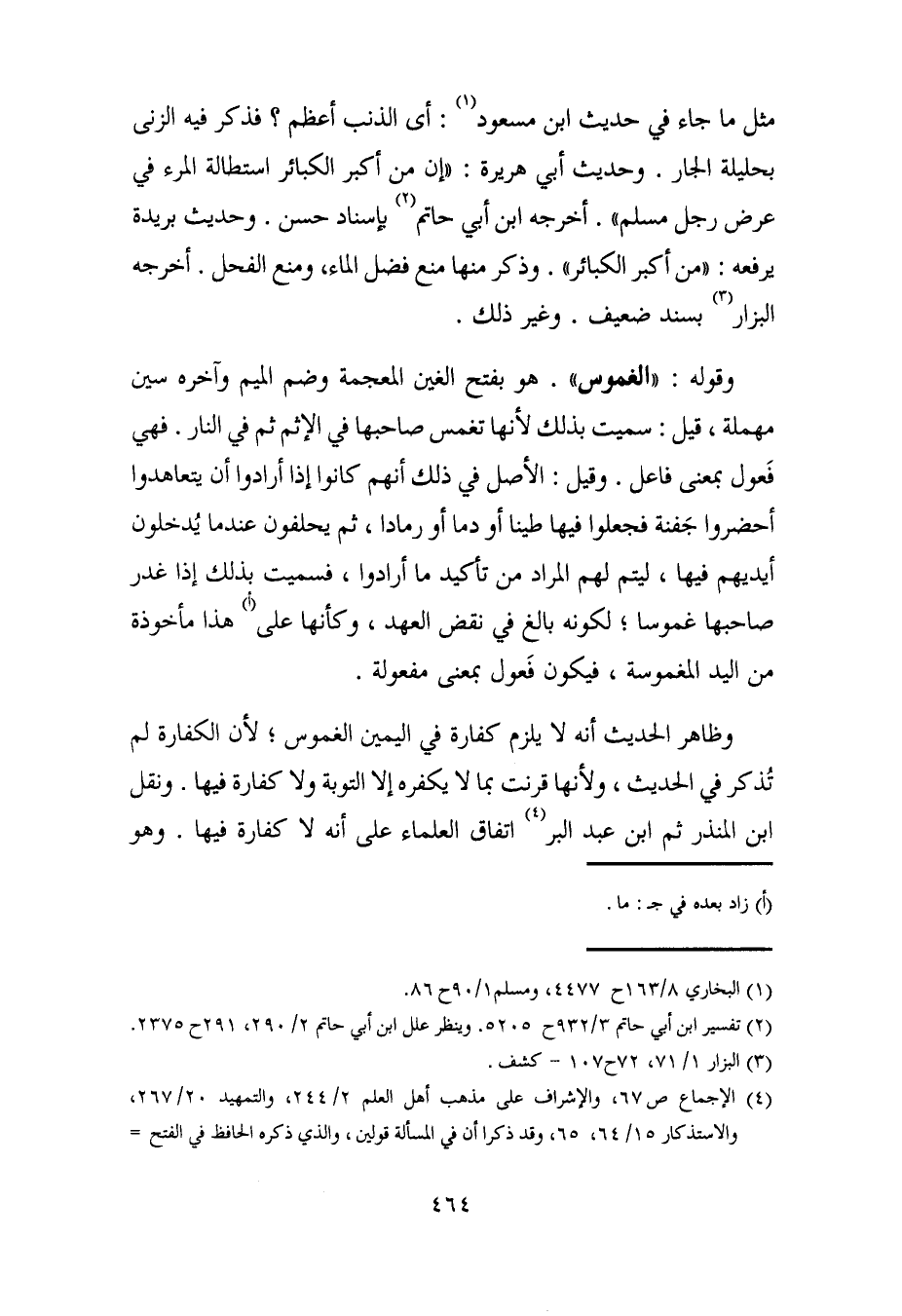 وقوله: "الغموس". هو بفتح الغين المعجمة وضم الميم وآخره سين مهملة، قيل: سميت بذلك لأنها تغمس صاحبها في الإثم ثم في النار. فهي فَعول بمعنى فاعل. وقيل: الأصل في ذلك أنهم كانوا إذا أرادوا أن يتعاهدوا أحضروا جَفنة فجعلوا فيها طينا أو دما أو رمادا، ثم يحلفون عندما يُدخلون أيديهم فيها، ليتم لهم المراد من جميد ما أرادوا، فسميت بذلك إذا غدر صاحبها غموسا؛ لكونه بالغ في نقض العهد، وكأنها على (أ) هذا مأخوذة من اليد المغموسة، فيكون فَعول بمعنى مفعولة.