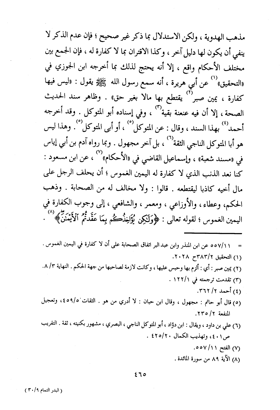 = 11/ 557 عن ابن المنذر وابن عبد البر اتفاق الصحابة على أن لا كفارة في اليمين الغموس.