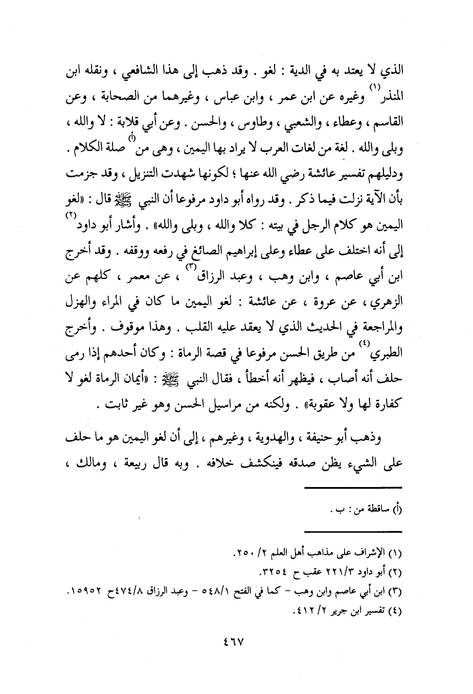 الذي لا يعتد به في الدية: لغو. وقد ذهب إلى هذا الشافعي، ونقله ابن المنذر (¬1) وغيره عن ابن عمر، وابن عباس، وغيرهما من الصحابة، وعن القاسم، وعطاء، والشعبي، وطاوس، والحسن. وعن أبي قلابة: لا والله، وبلى والله. لغة من لغات العرب لا يراد بها اليمين، وهي من (أ) صلة الكلام. ودليلهم تفسير عائشة رضي الله عنها؛ لكونها شهدت التنزيل، وقد جزمت بأن الآية نزلت فيما ذكر. وقد رواه أبو داود مرفوعًا أن النبي - صلى الله عليه وسلم - قال: "لغو اليمين هو كلام الرجل في بيته: كلا والله، وبلى والله". وأشار أبو داود (¬2) إلى أنه اختلف على عطاء وعلى إبراهيم الصائغ في رفعه ووقفه. وقد أخرج ابن أبي عاصم، وابن وهب، وعبد الرزاق (¬3)، عن معمر، كلهم عن الزهري، عن عروة، عن عائشة: لغو اليمين ما كان في المراء والهزل والمراجعة في الحديث الذي لا يعقد عليه القلب. وهذا موقوف. وأخرج الطبري (¬4) من طريق الحسن مرفوعًا في قصة الرماة: وكان أحدهم إذا رمى حلف أنه أصاب، فيظهر أنه أخطأ، فقال النبي - صلى الله عليه وسلم -: "أيمان الرماة لغو لا كفارة لها ولا عقوبة". ولكنه من مراسيل الحسن وهو غير ثابت.