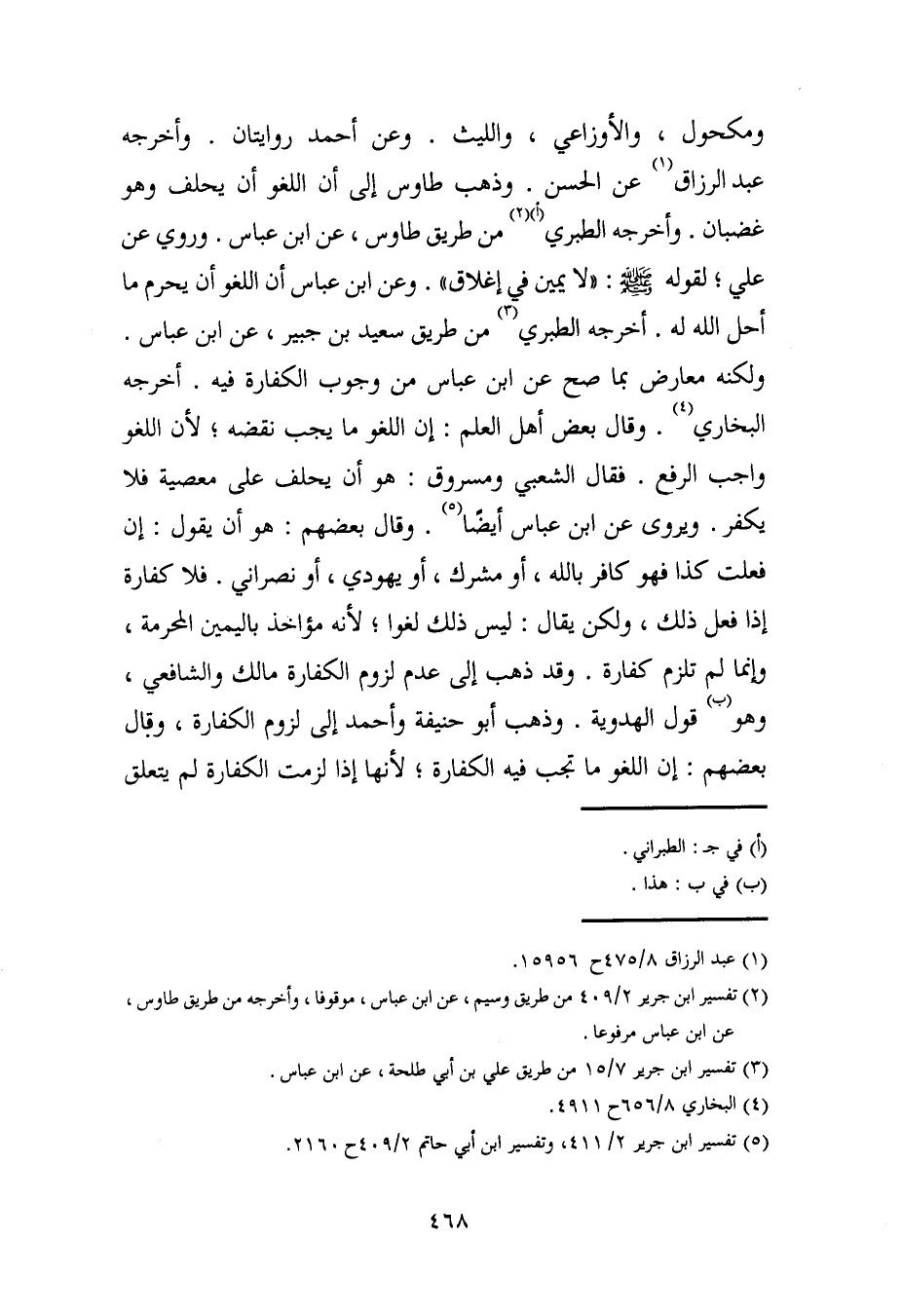 ومكحول، والأوزاعي، والليث. وعن أحمد روايتان. وأخرجه عبد الرزاق (¬1) عن الحسن. وذهب طاوس إلى أن اللغو أن يحلف وهو غضبان. وأخرجه الطبري (أ) (¬2) من طريق طاوس، عن ابن عباس. وروي عن علي؛ لقوله - صلى الله عليه وسلم -: "لا يمين في إغلاق". وعن ابن عباس أن اللغو أن يحرم ما أحل الله له. أخرجه الطبري (¬3) من طريق سعيد بن جبير، عن ابن عباس. ولكنه معارض بما صح عن ابن عباس من وجوب الكفارة فيه. أخرجه البخاري (¬4). وقال بعض أهل العلم: إن اللغو ما يجب نقضه؛ لأن اللغو واجب الرفع. فقال الشعبي ومسروق: هو أن يحلف على معصية فلا يكفر. ويروى عن ابن عباس أيضًا (¬5). وقال بعضهم: هو أن يقول: إن فعلت كذا فهو كافر بالله، أو مشرك، أو يهودي، أو نصراني. فلا كفارة إذا فعل ذلك، ولكن يقال: ليس ذلك لغوا؛ لأنه مؤاخذ باليمين المحرمة، وإنما لم تلزم كفارة. وقد ذهب إلى عدم لزوم الكفارة مالك والشافعي، وهو (ب) قول الهدوية. وذهب أبو حنيفة وأحمد إلى لزوم الكفارة، وتجال بعضهم: إن اللغو ما تجب فيه الكفارة؛ لأنها إذا لزمت الكفارة لم يتعلق