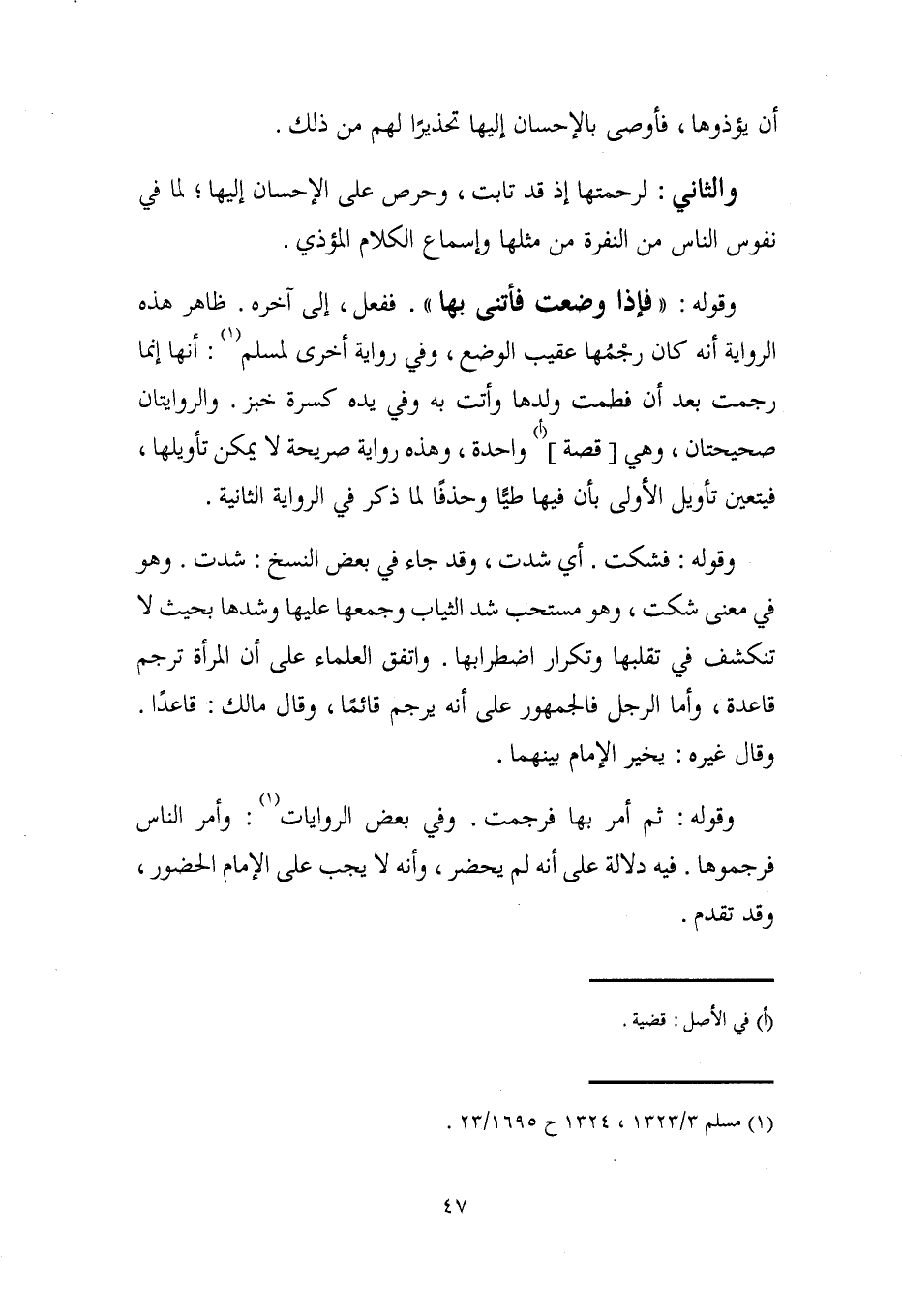 وقوله: ثم أمر بها فرجمت. وفي بعض الروايات (1): وأمر الناس فرجموها. فيه دلالة على أنه لم يحضر، وأنه لا يجب على الإمام الحضور، وقد تقدم.